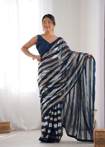Petrol Beautiful Georgette Fabric Sequins Work Ceremonial Saree