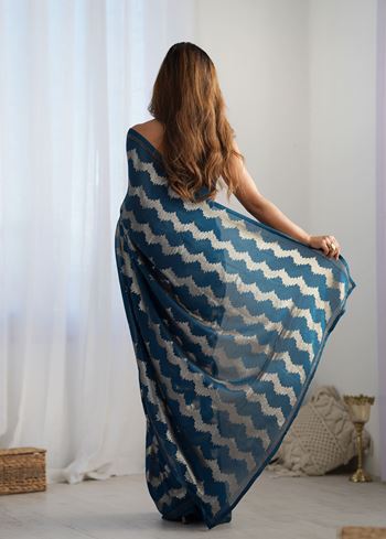 This designer saree blends Bollywood-inspired contemporary charm with traditional craftsmanship, offering a lightweight, flowing drape that ensures comfort while maintaining a graceful silhouette. Perfect for evening parties, festive gatherings, and special occasions, the striking petrol-blue hue paired with sparkling sequins makes a bold and stylish statement.