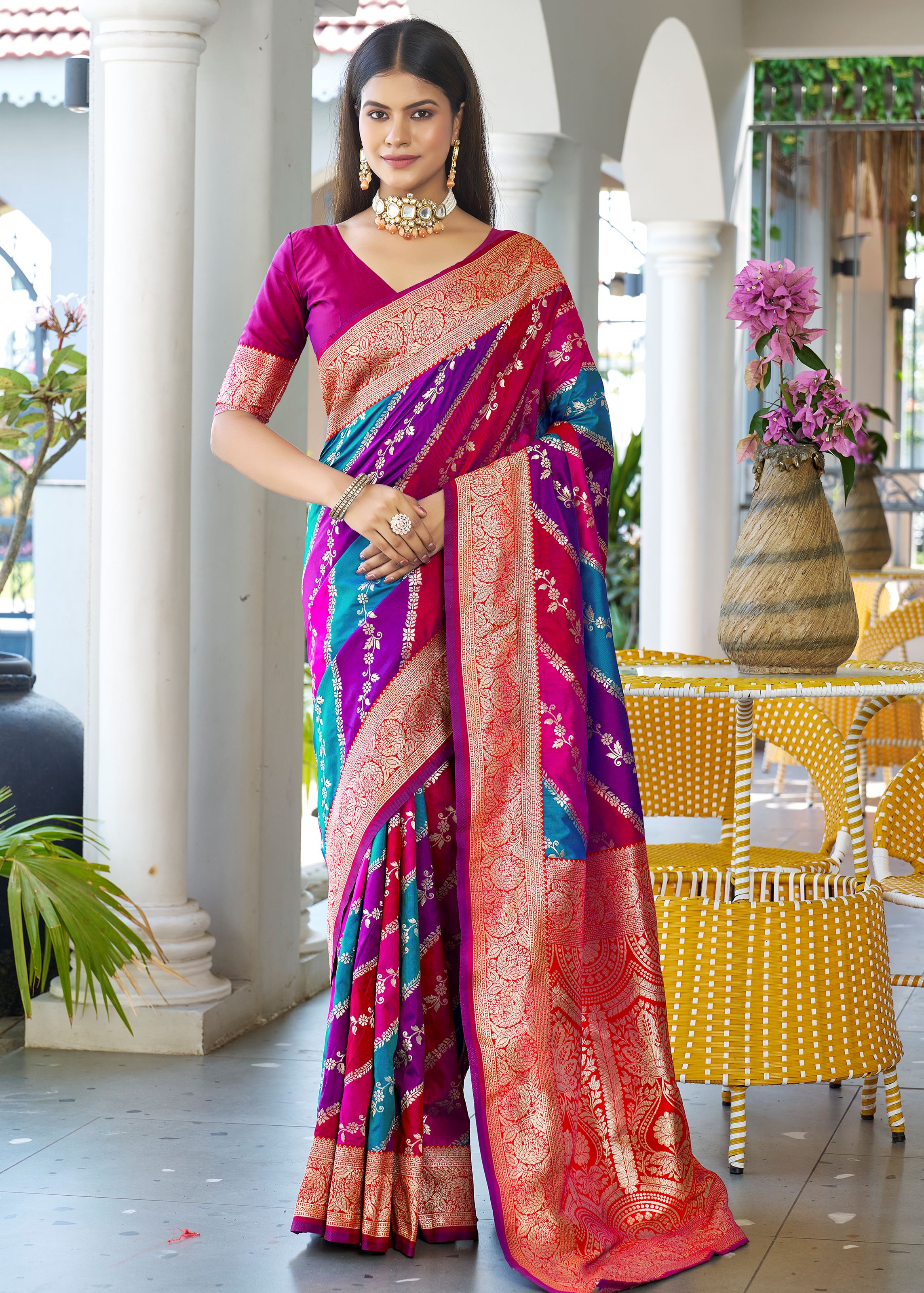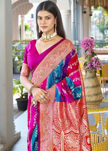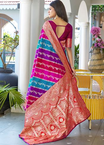 The vibrant pink body is accentuated with elegant Leriya-style zari weaves, bringing rhythmic texture and a timeless vibe to the ensemble. A bold contrast pallu in Rani pink adds flair and drama, beautifully matched with a Rani Banarasi silk blouse for a coordinated and regal finish.