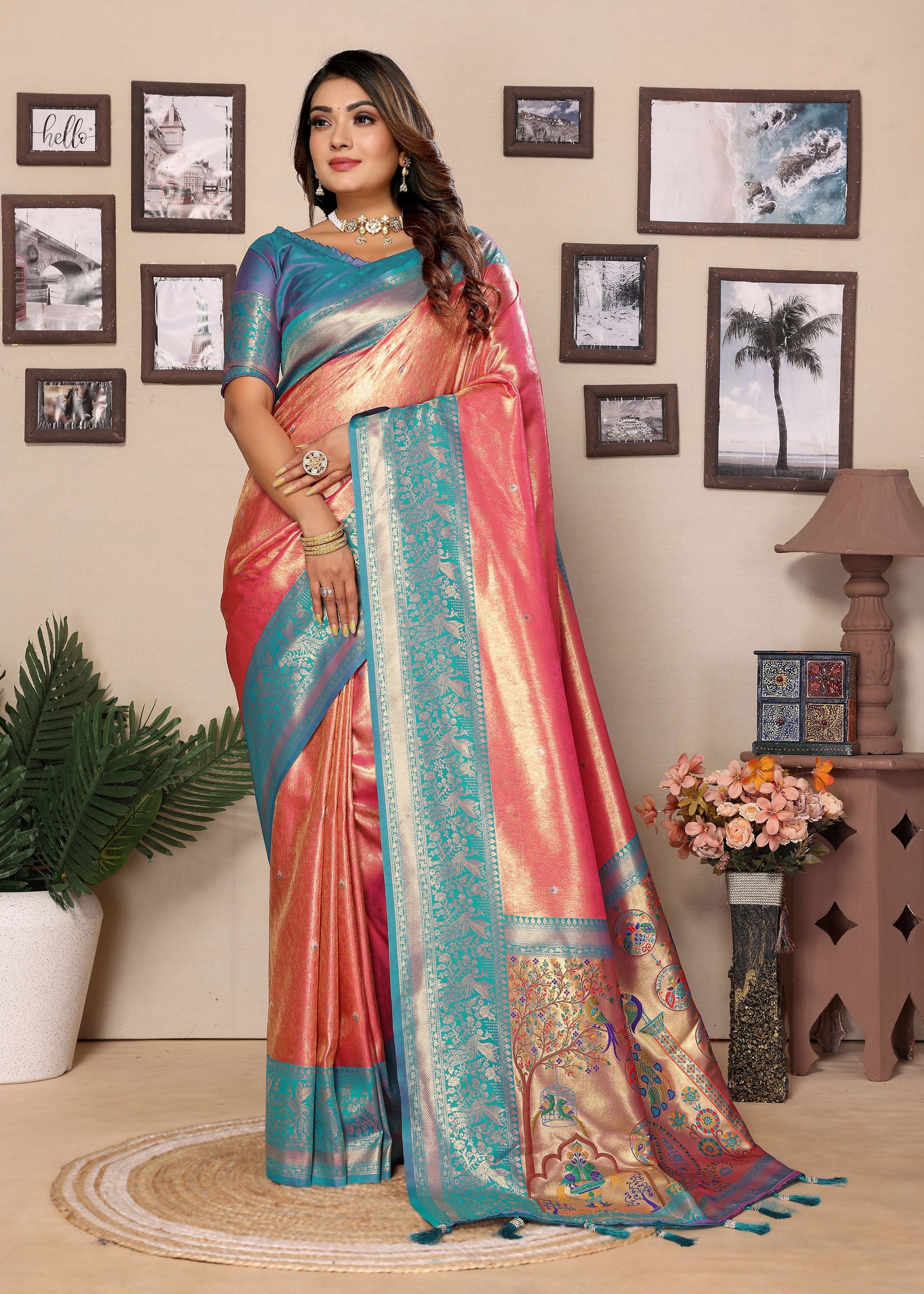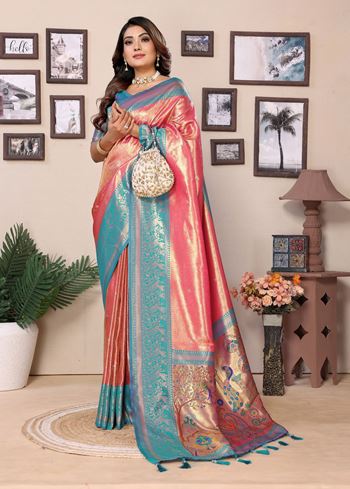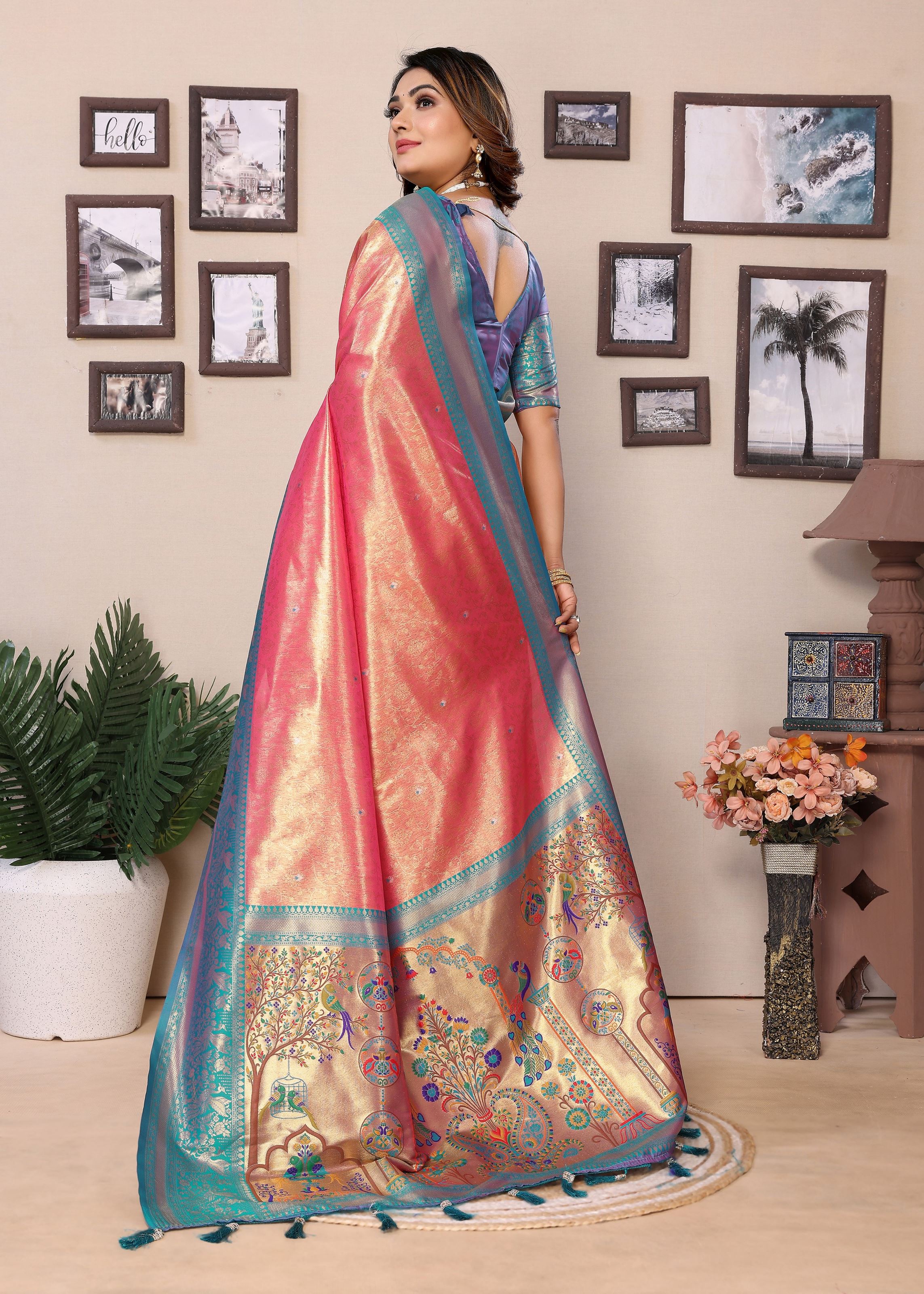 The soft pink base is beautifully complemented by a contrasting blue silk blend blouse, creating a striking and elegant ensemble. Its luxurious tissue silk fabric drapes effortlessly, highlighting the detailed woven Jari patterns while ensuring comfort and a flattering fit. Designed for women who appreciate authentic craftsmanship and traditional elegance, this designer saree makes a statement at bridal functions, festive gatherings, and special celebrations.