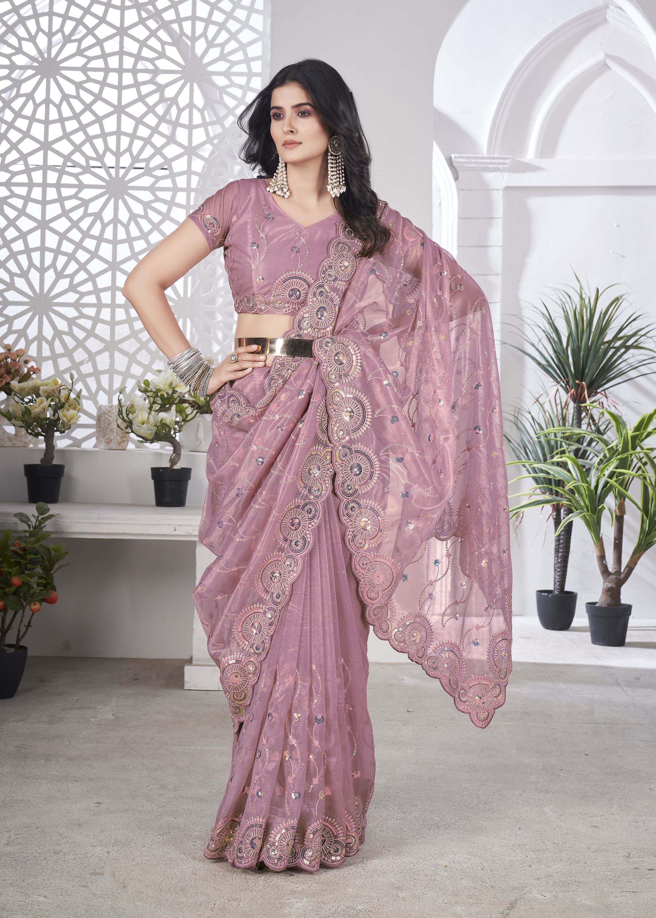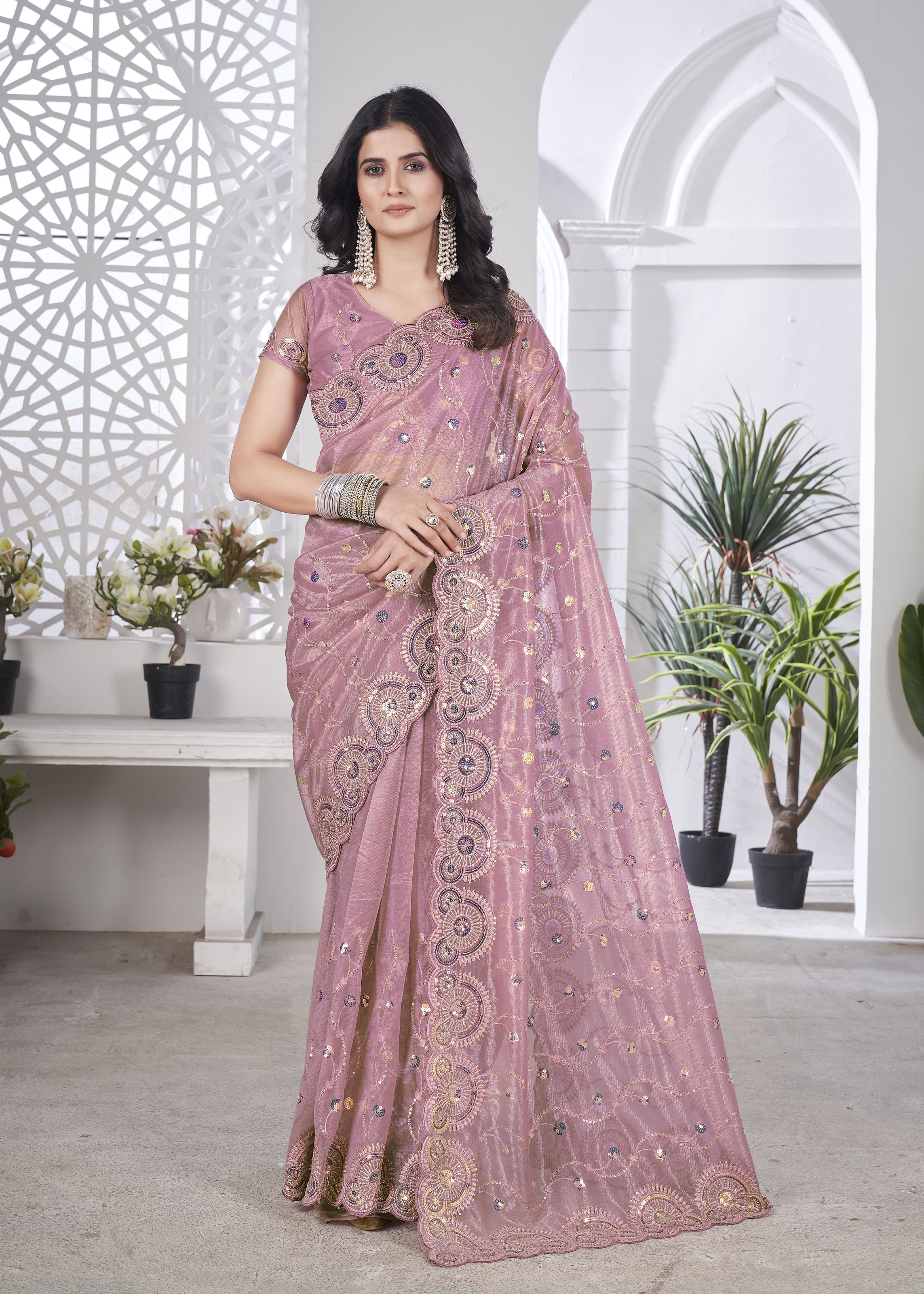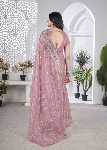 Elevate your ethnic style with this Pink Beautiful Tissue Net Sequins Work Saree from Aethnofit Fashions. Designed with delicate tissue net fabric, this saree flows with effortless grace, making it perfect for weddings, festive celebrations, receptions, or glamorous evening parties. The soft pink hue exudes femininity and elegance, while the intricate sequins embroidery adds a sparkling touch that makes you stand out on every occasion. The matching pink tissue blouse enhances the coordinated designer look, giving this ensemble a flawless finish.