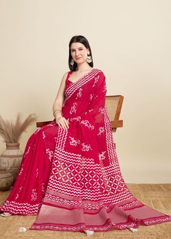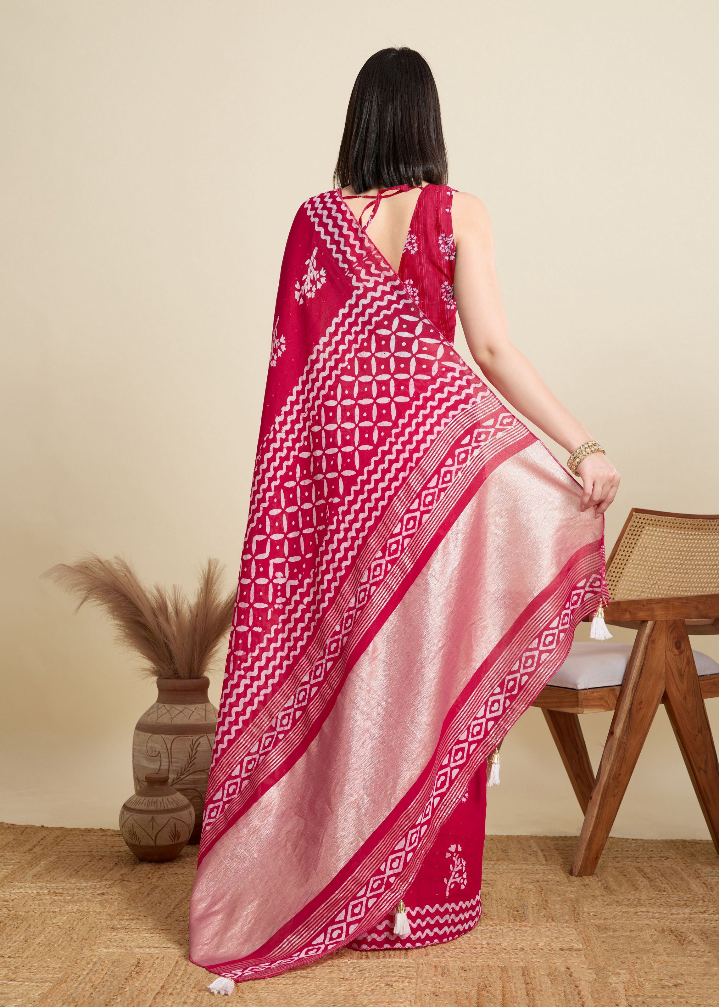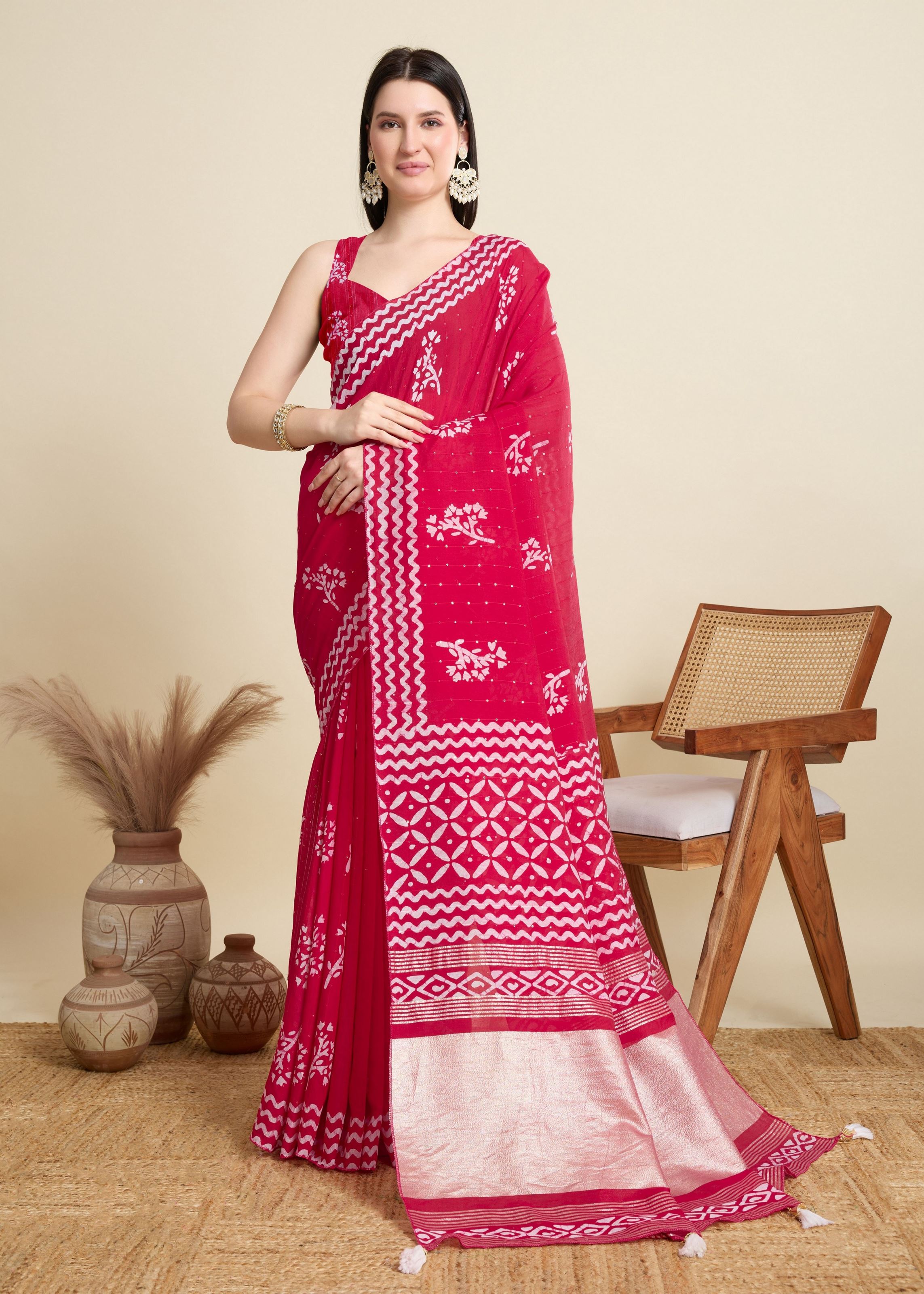 The set includes an unstitched blended cotton blouse in matching pink, allowing you to customize it to your preferred design for a perfect fit. Pair this saree with traditional jewelry, bangles, and ethnic footwear to complete your festive look.