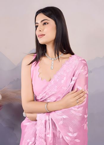 Crafted from premium Burberry silk, the saree boasts a smooth, luminous texture that flows effortlessly with every step. The soft pink hue brings a romantic and feminine touch, while the intricately embroidered C-Pallu adds depth, movement, and subtle sparkle through carefully placed sequins. A matching pink blouse in mono Banglory silk completes the ensemble, ideal for customized tailoring to suit your personal silhouette and style.
