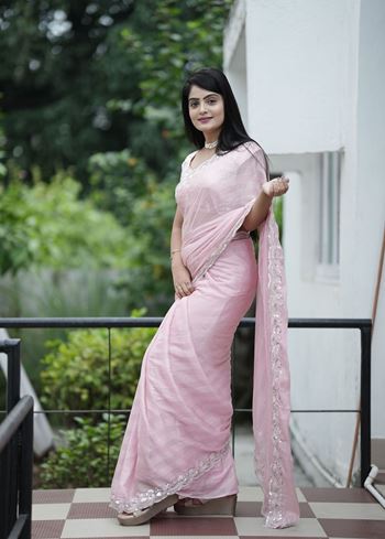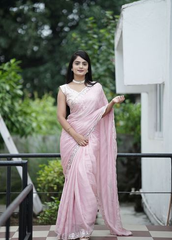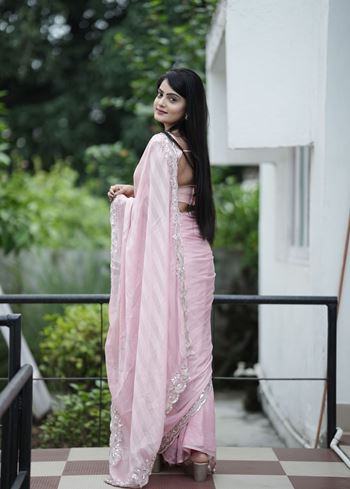 Pink Chiffon Fabric Beautiful Sequins Embroidery Work Partywear Saree