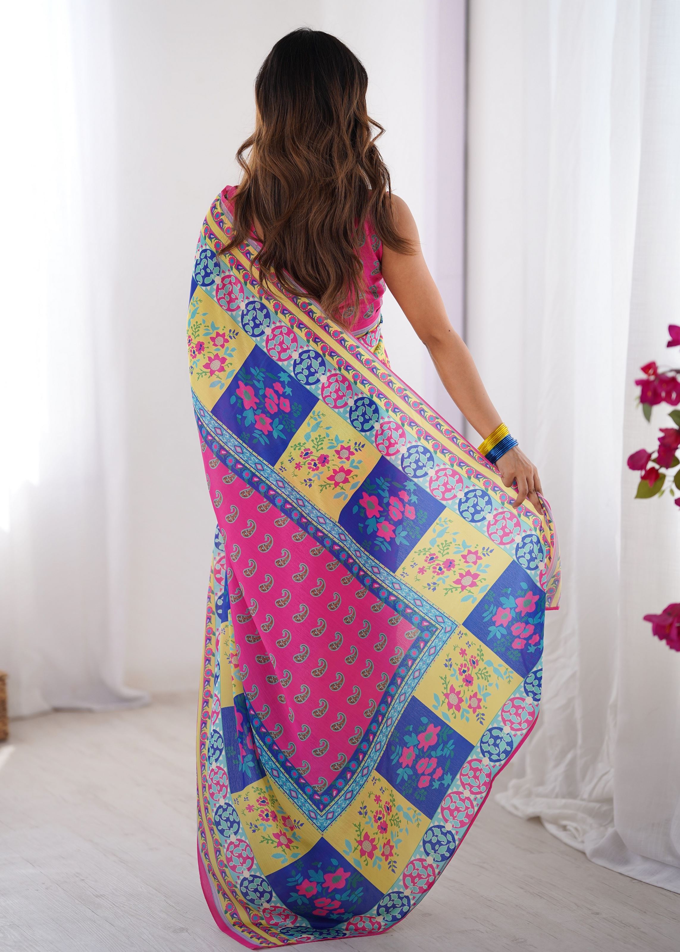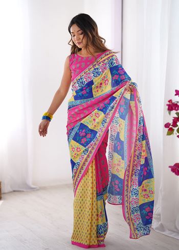 The elegant pink shade gives this saree a feminine and youthful charm, while the designer printed patterns add a trendy touch, making it suitable for modern festive occasions as well as traditional gatherings. Whether you are attending a wedding function, festive celebration, or a classy evening party, this saree ensures you stand out in effortless style.