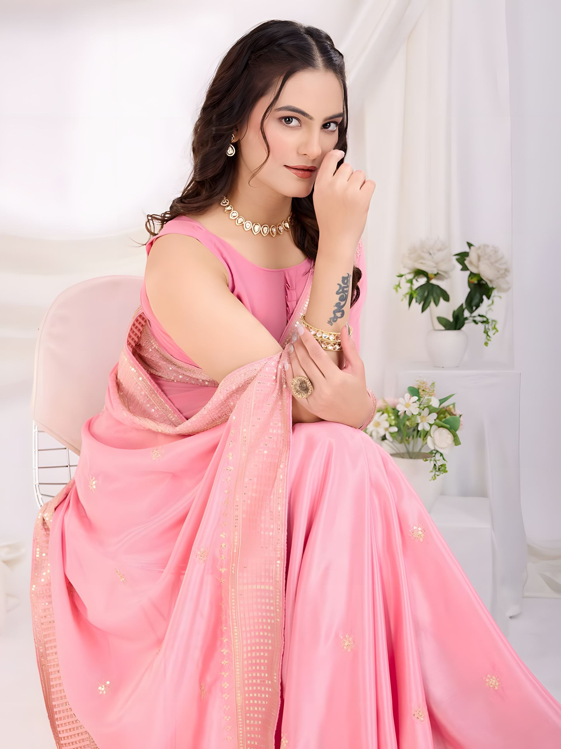 Pink Chinon Silk Saree with C pallu all Over Embroidery and Sequins Work