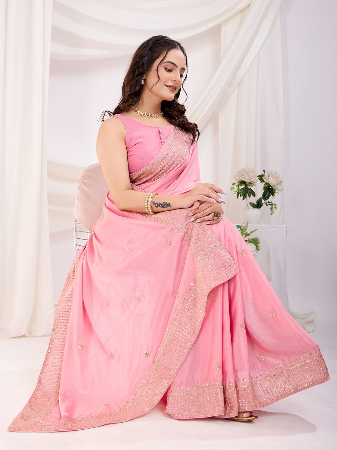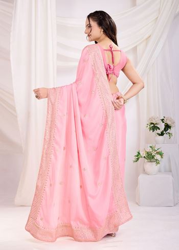 Pink Chinon Silk Desigenr Zari Embroidered Ceremonial Saree