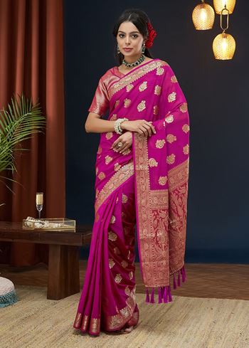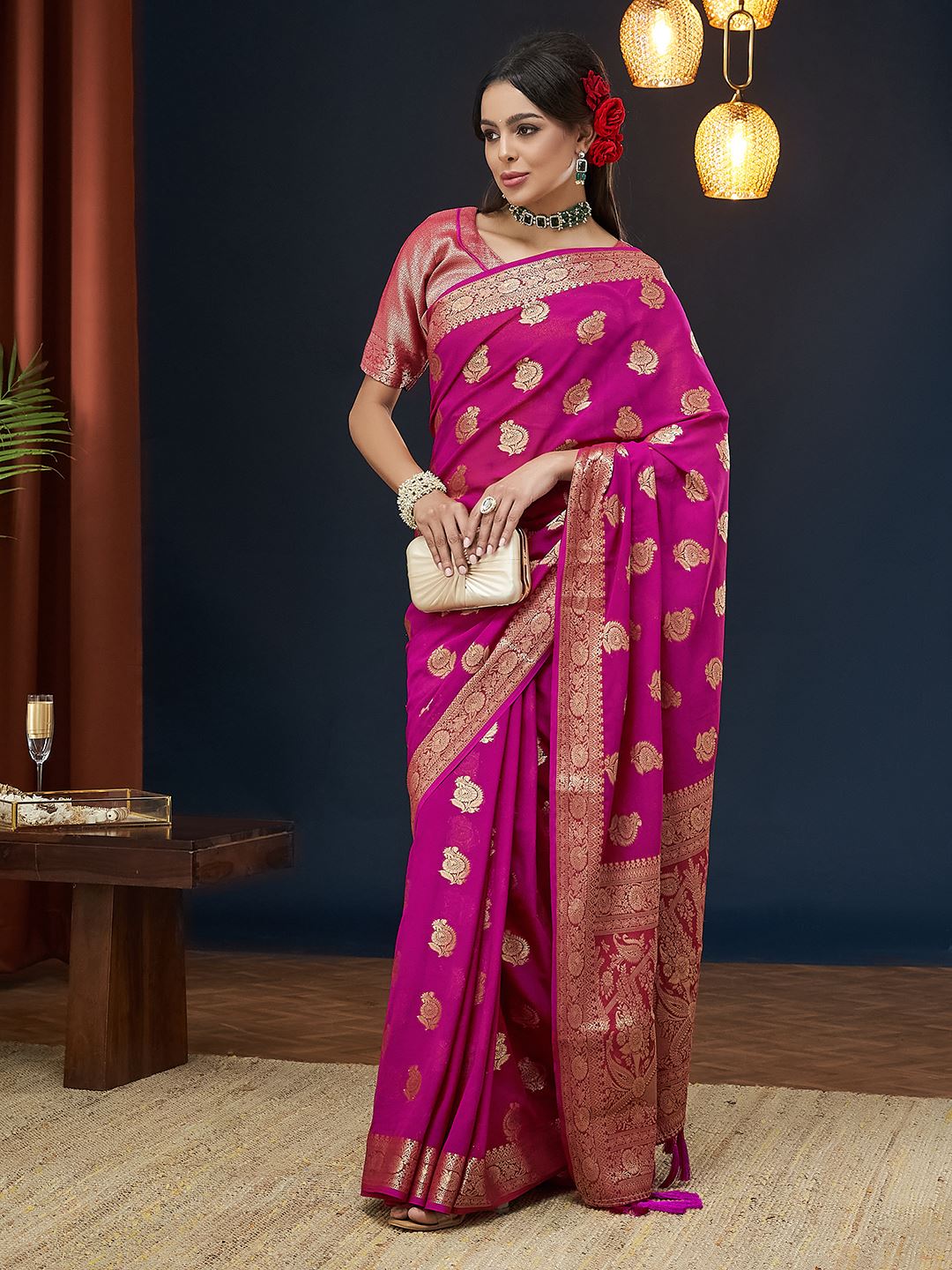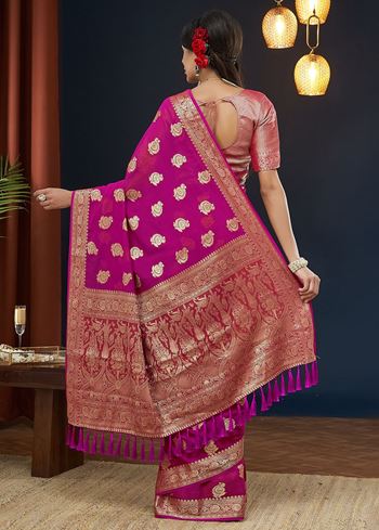 This saree is paired with a matching pink georgette blouse, completing the ensemble with a refined designer appeal. The woven zari artistry reflects skilled craftsmanship, creating a striking blend of traditional elegance and modern styling. Whether you choose to drape it in a classic way or experiment with contemporary styles, this saree promises a graceful statement at every event.