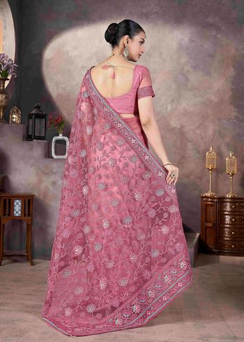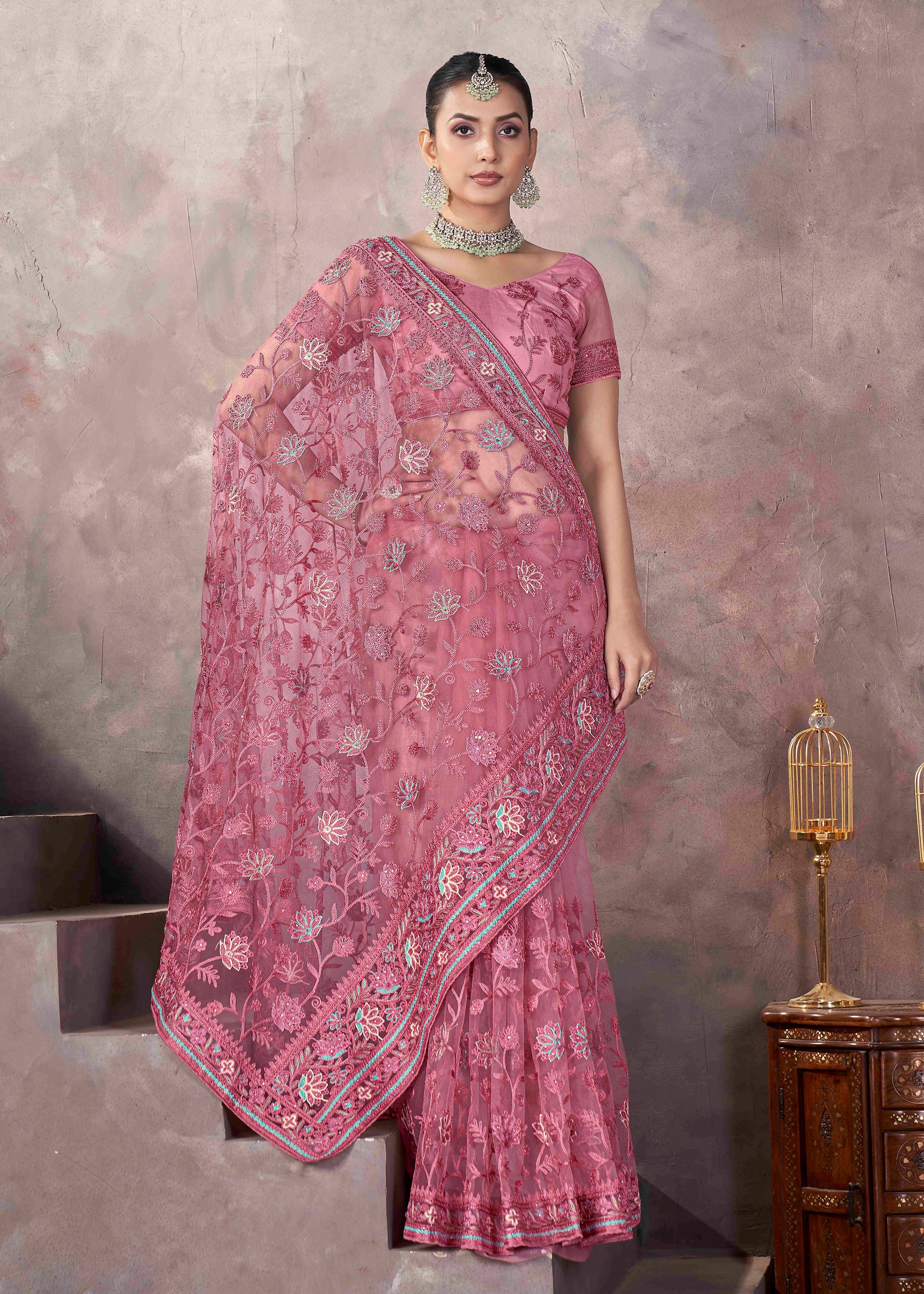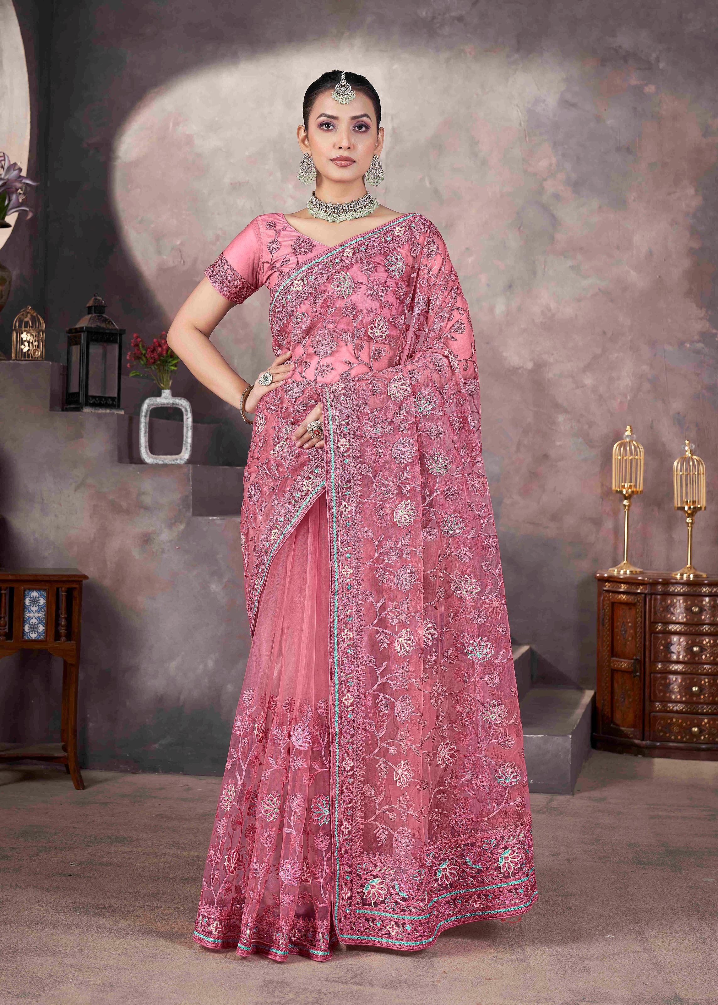 Pink Designer Thread Embroidery Work Butterfly Net Ceremonial Saree