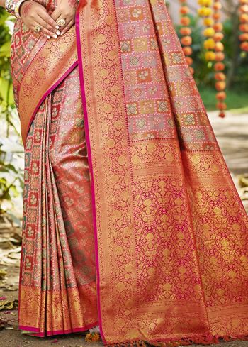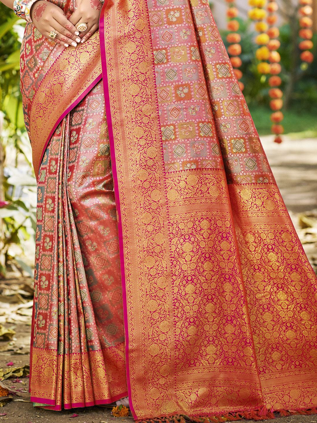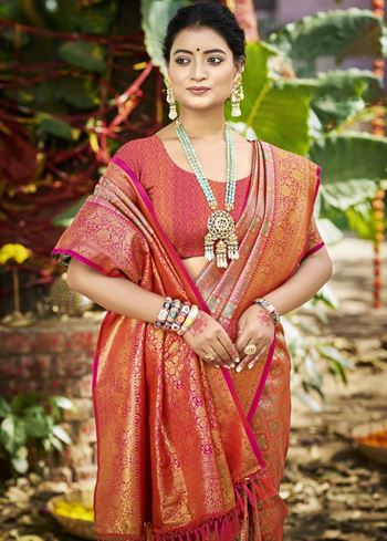 The saree is paired with a perfectly matched pink Dharmavaram blouse, allowing for cohesive styling that feels both traditional and elevated. The fabric features a signature weave that gives the drape a structured, luxurious fall while remaining comfortable for all-day wear. It’s a classic silhouette with a modern sensibility—ideal for women who value understated beauty.