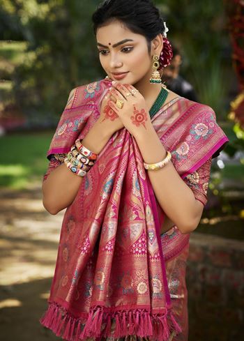 Step into the world of regal tradition with this Pink Dharmavaram Saree from Aethnofit Fashions. Woven in the legendary Dharmavaram style, known for its heavy borders and intricate detailing, this saree embodies heritage craftsmanship with a soft, feminine twist. The charming pink shade adds a touch of grace and vibrancy, making it ideal for festive occasions, religious ceremonies, or cultural events.