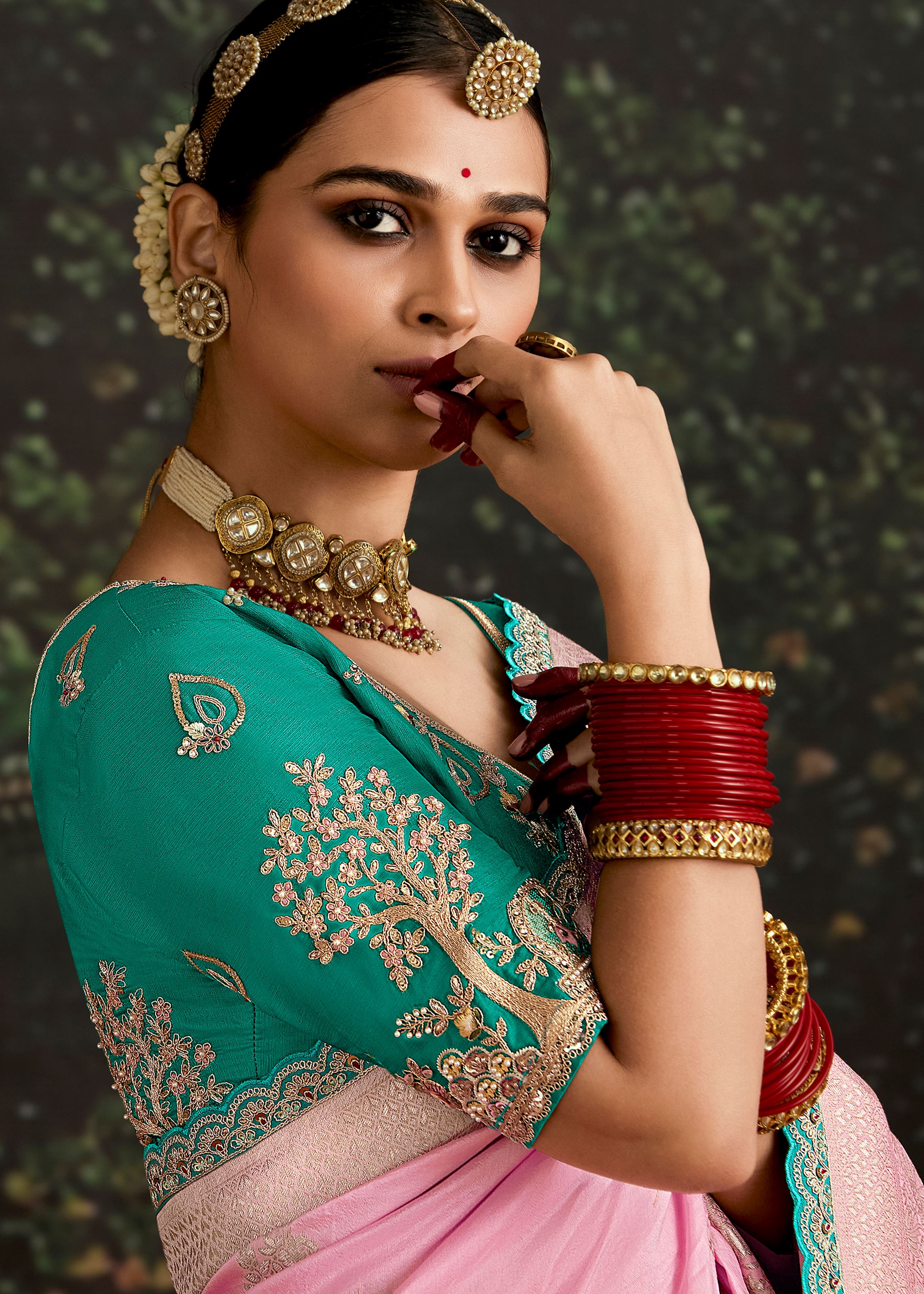 Pink Dola Silk Saree With Jacquard Woven with Embroidered Lace Border