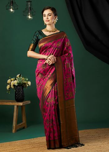 The saree is complemented with a contrasting green silk blouse, creating a striking combination that balances vibrancy and sophistication. Designed with woven craftsmanship, the drape offers both comfort and style, making it suitable for traditional pleats or modern draping styles. Its rich texture and exquisite woven patterns ensure you stand out gracefully at every occasion.