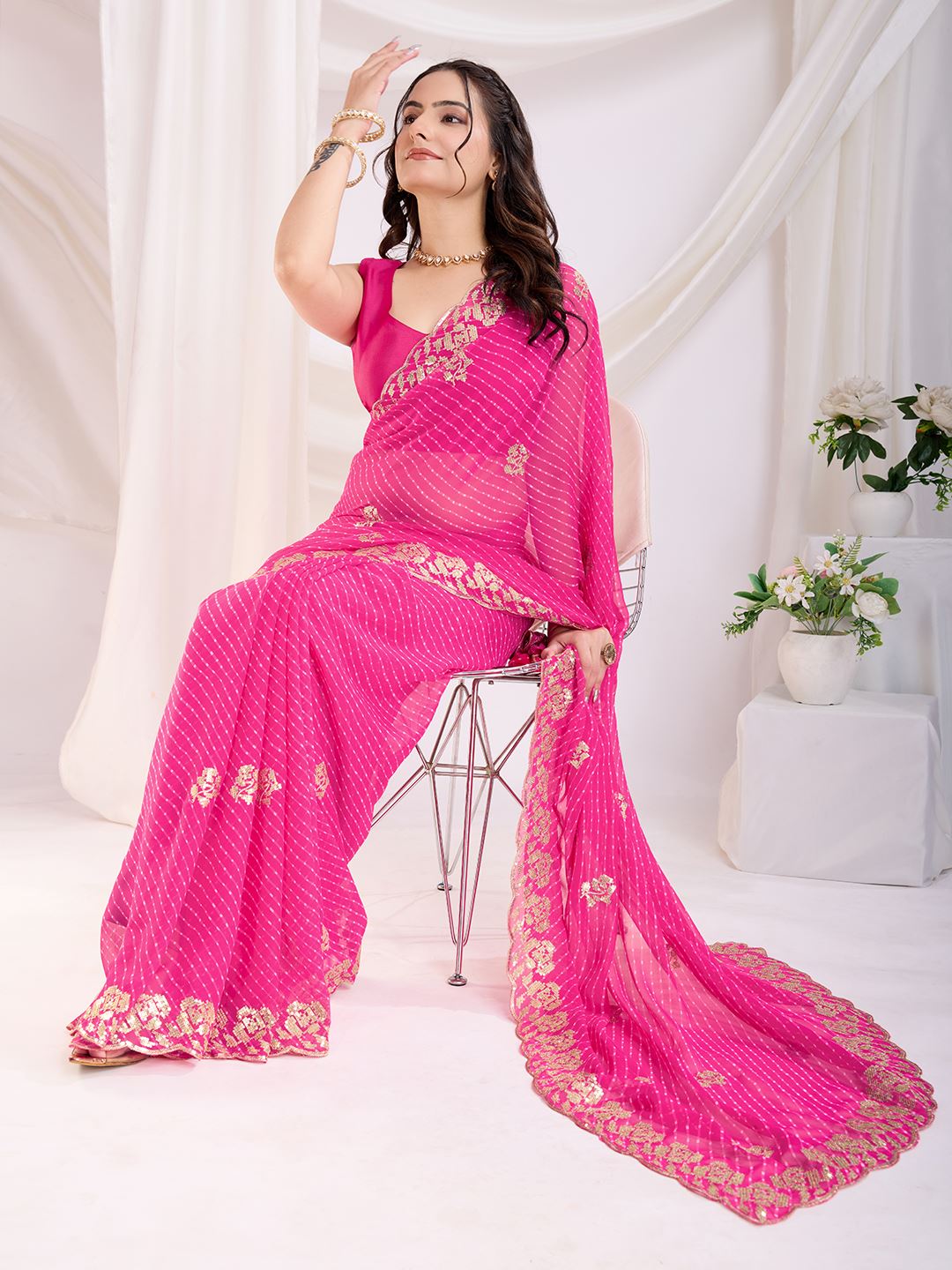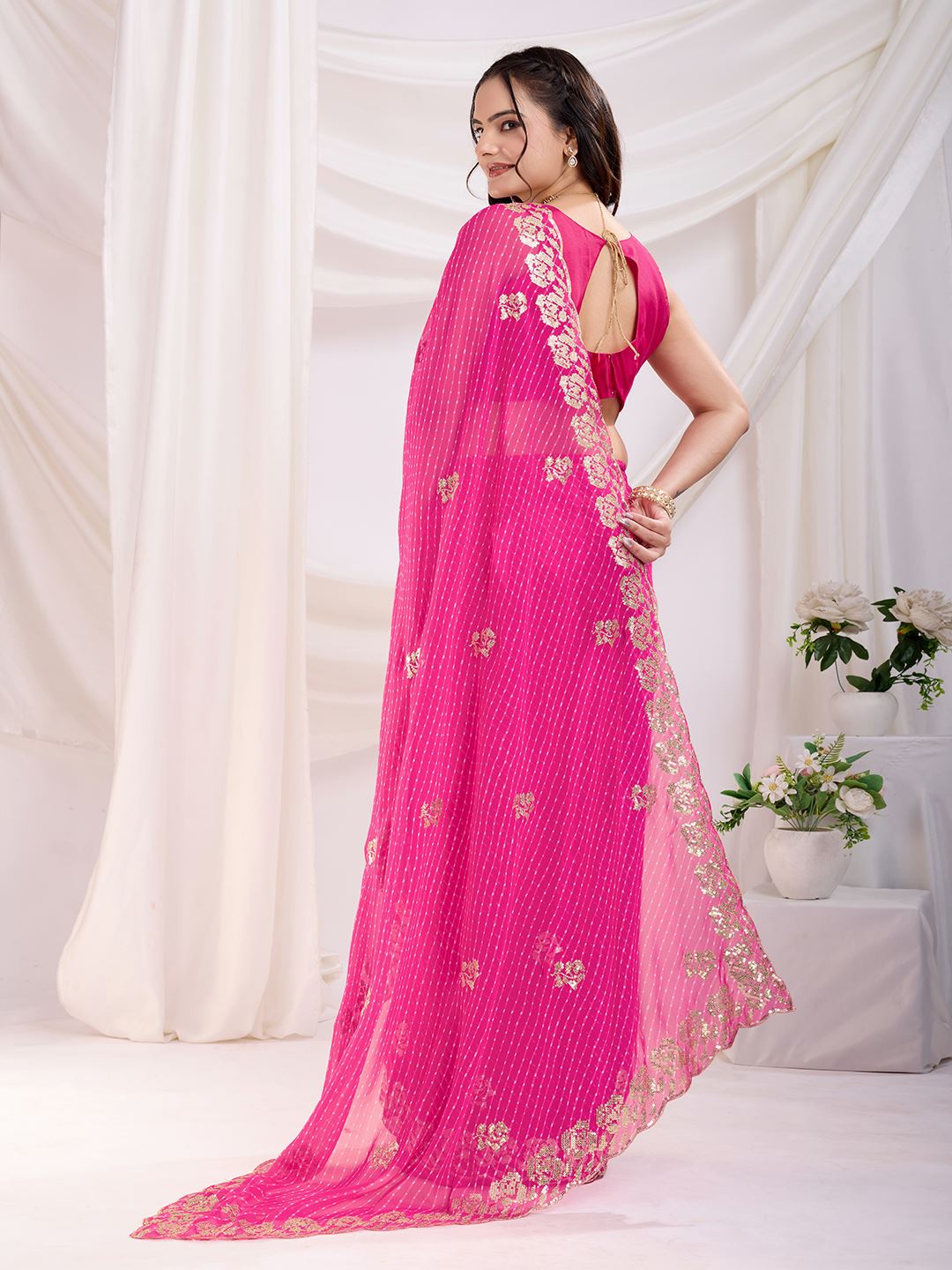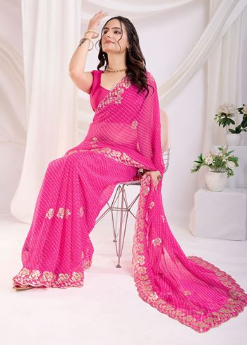 Step into the spotlight with this Pink Georgette Sequins Designer Bollywood Saree, a perfect blend of elegance, grace, and glamour. Designed with the finest georgette fabric, this saree drapes effortlessly, offering a soft, flowy silhouette that enhances every move you make. The enchanting pink color exudes charm and femininity, making it an ideal choice for weddings, festive gatherings, receptions, or glamorous parties.