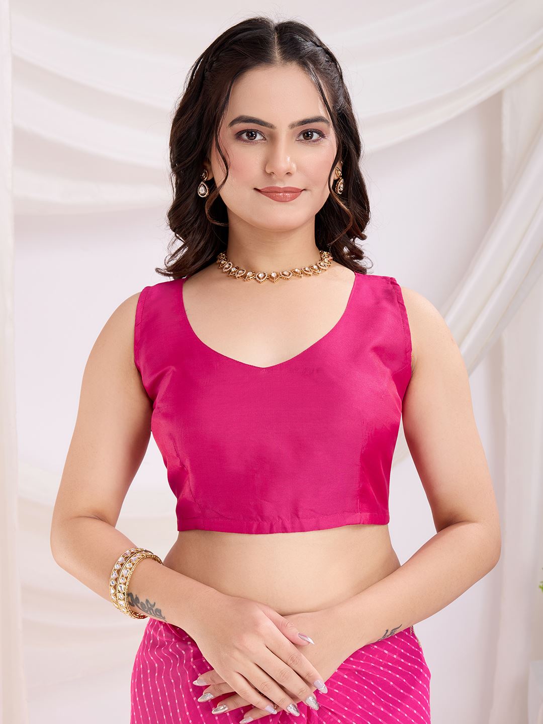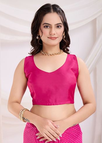 Accompanied by a matching pink art silk blouse, exquisitely crafted with embroidered detailing, this ensemble completes the perfect Bollywood-inspired look. The blouse can be tailored to your preferred style, whether you want a modern chic cut or a traditional design.This saree is more than just attire—it’s a statement of sophistication and timeless fashion. Pair it with statement jewelry and elegant heels to create a show-stopping look. Perfect for the modern woman who loves to embrace tradition with a contemporary twist.