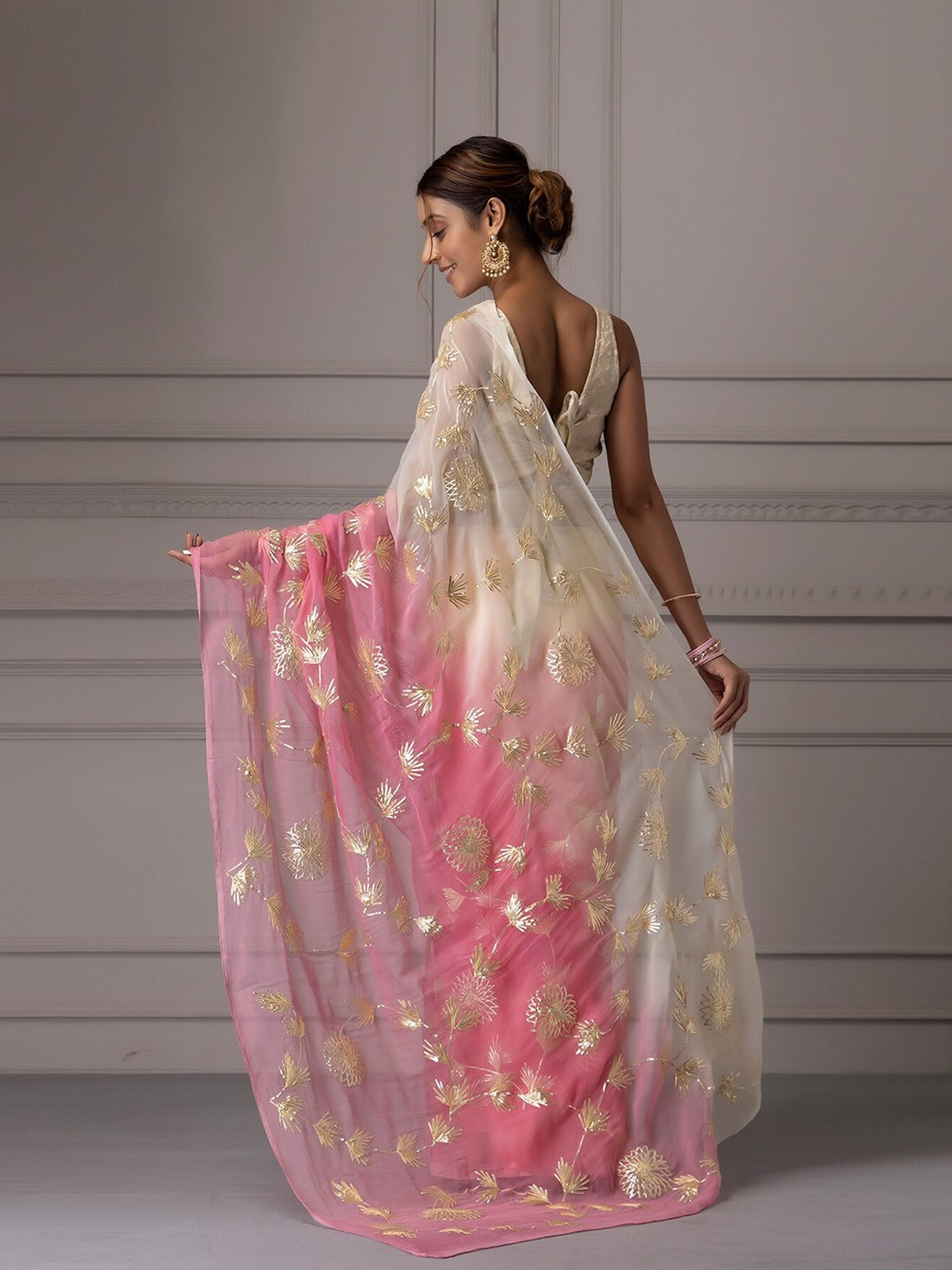 The delicate pink base is complemented by a cream silk blend blouse, creating a soft, harmonious contrast that enhances the saree’s beauty. Its lightweight organza fabric drapes gracefully, highlighting the intricate embroidery and ensuring comfort throughout the day. Designed for women who appreciate traditional craftsmanship infused with contemporary style, this saree is ideal for bridal events, festive occasions, and ceremonial functions.