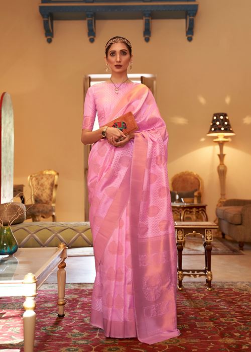 Pink Handloom Silk Saree With Copper Zari Woven Work