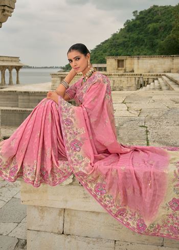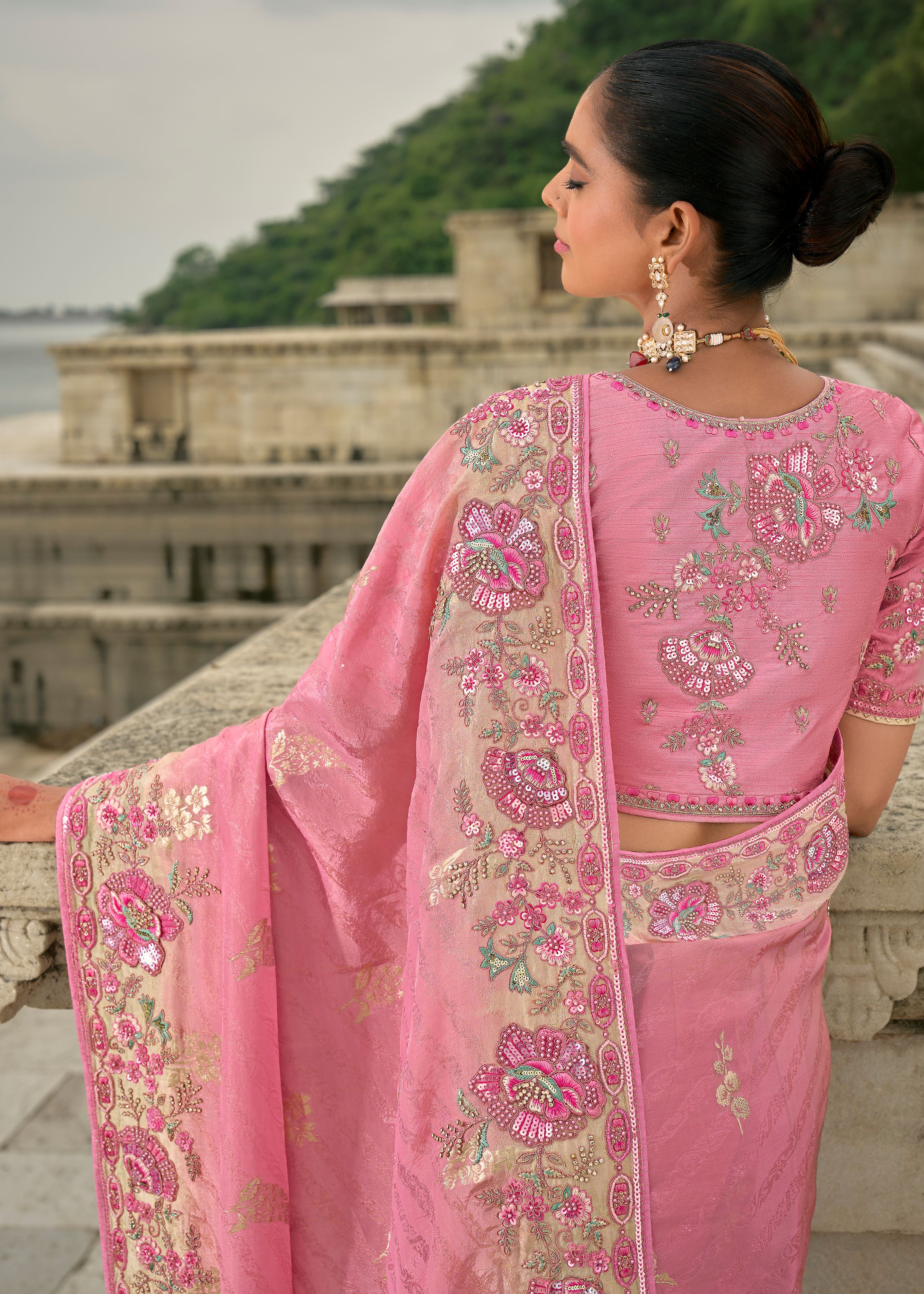 Pink Jacquard Saree With Heavy Thread Embroidery and Sequins Work