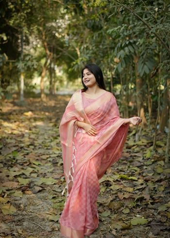The radiant pink color embodies femininity, beauty, and grace, creating a vibrant yet sophisticated look. Adorned with intricate zari woven motifs, the saree reflects the artistry of traditional weaving techniques. The shimmering golden threads add depth and luxury to the design, ensuring you make an impression at every celebration.