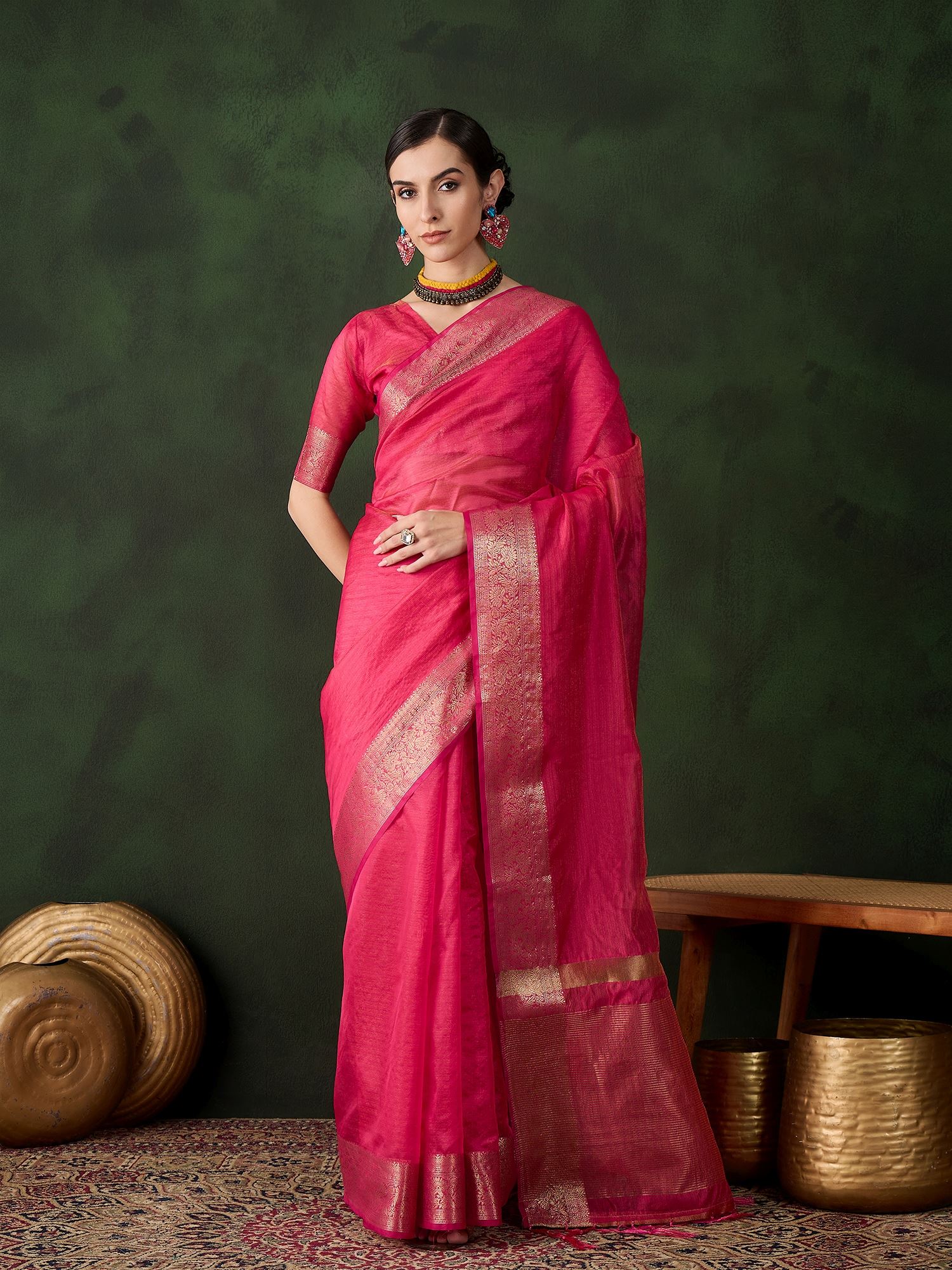 The saree features exquisite woven jacquard patterns, adding depth, richness, and traditional artistry to its overall appeal. Its subtle sheen enhances the festive vibe, while the texture ensures comfort throughout long hours of wear. Paired with a matching pink organza blouse, this saree offers endless styling possibilities. You can elevate the traditional look with classic gold or kundan jewelry, or give it a modern twist by pairing it with statement accessories.