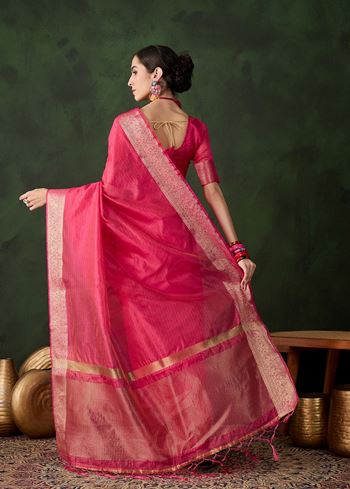 Radiate elegance and charm with this Pink Khadi Organza Woven Jacquard Saree, thoughtfully designed for women who love celebrating traditions with style. Crafted from premium quality khadi organza fabric, this saree is lightweight, breathable, and flows gracefully, giving you an effortlessly regal look. The soft yet vibrant pink shade brings out a feminine charm, making it ideal for festive occasions, weddings, cultural celebrations, and parties.