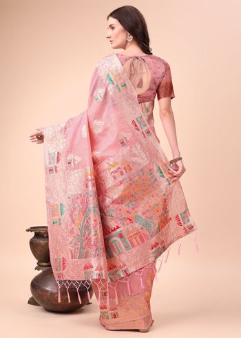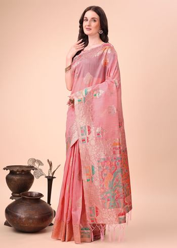 Pink Linen Cotton Woven Jacquard Designer Ethnic Festive Wear Saree