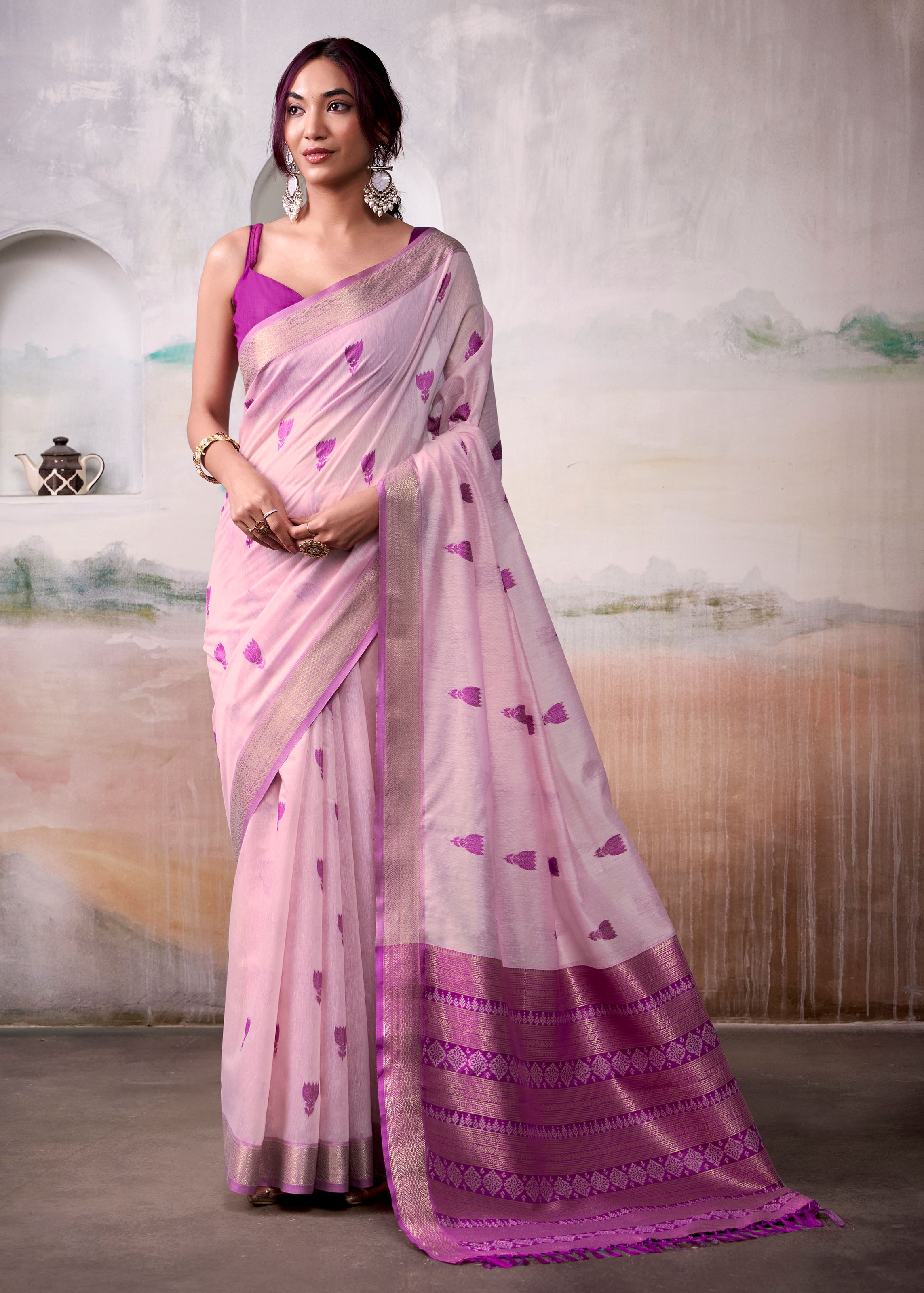 The saree is paired with a magenta-colored blouse crafted from modal cotton, creating a vibrant contrast that enhances the soft pink hue. The lightweight fabric drapes effortlessly, allowing you to achieve a graceful silhouette that is both stylish and comfortable for long hours of wear.