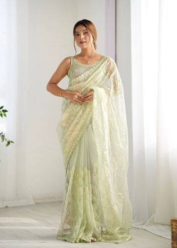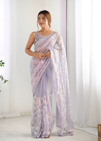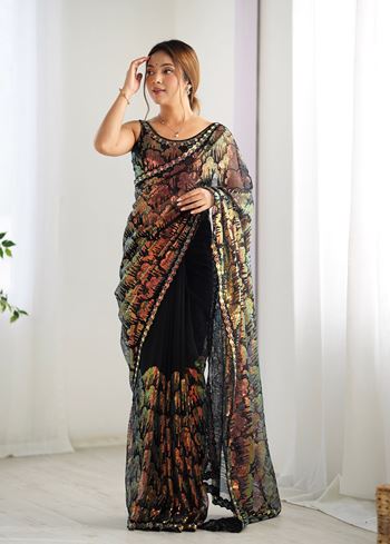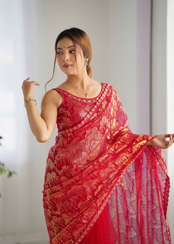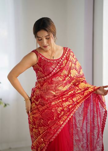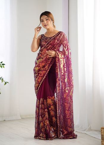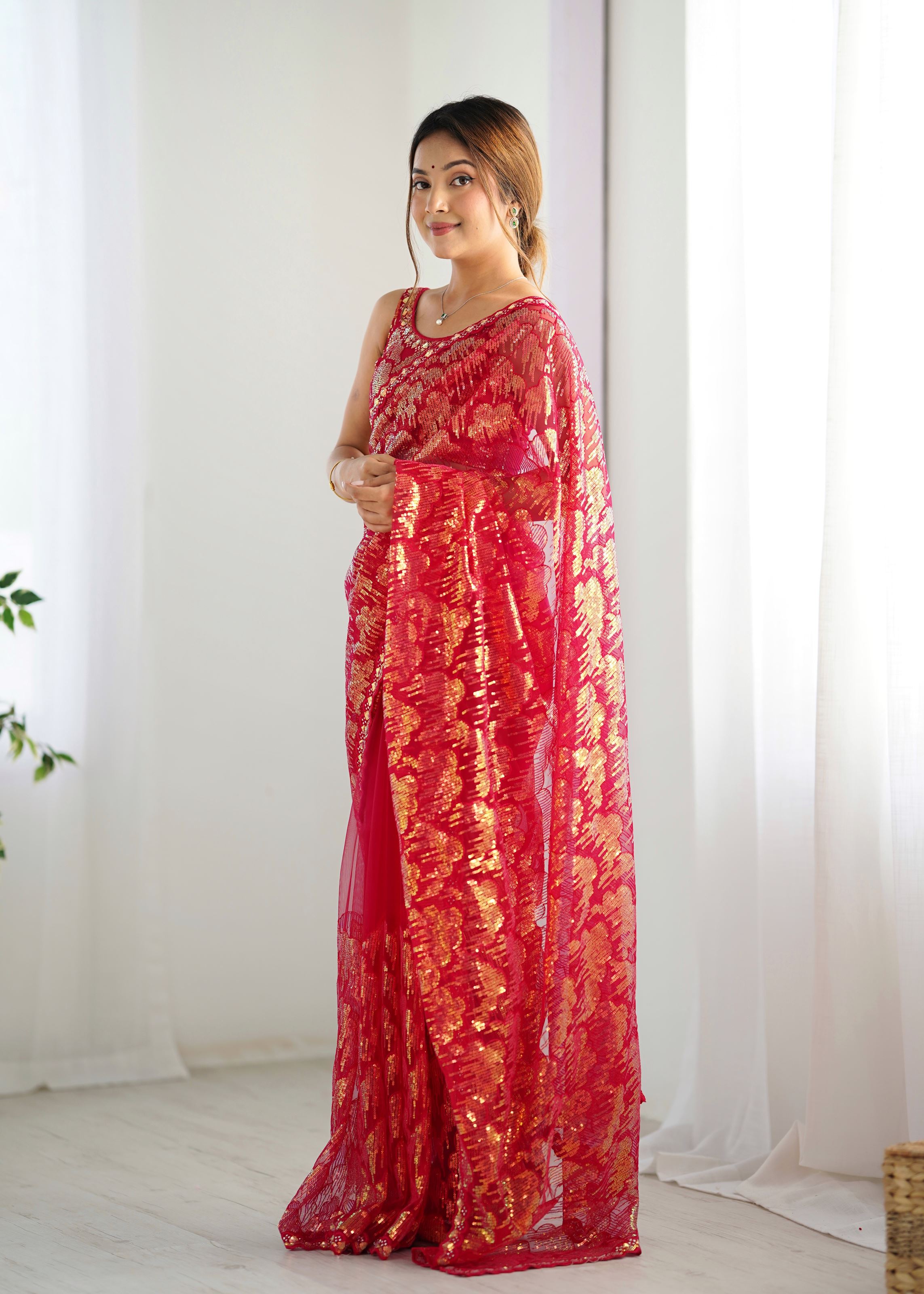 This saree is paired with a matching pink art silk blouse, designed with delicate embroidered accents to complete the ensemble. The seamless coordination of blouse and saree ensures a stylish yet traditional appeal, while the shimmer of sequins adds a glamorous touch. Perfect for women who seek a balance of modern designer style and timeless cultural elegance, this saree guarantees a standout look for any grand occasion.