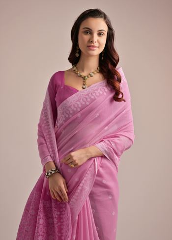 The soothing pink hue brings a soft, feminine touch to the ensemble, beautifully complemented by intricate thread butti work scattered across the saree. The highlight lies in the Lakhnawi-inspired pallu, which showcases delicate embroidery that adds a refined flair, reflecting the heritage of Lucknow’s artisanal legacy.