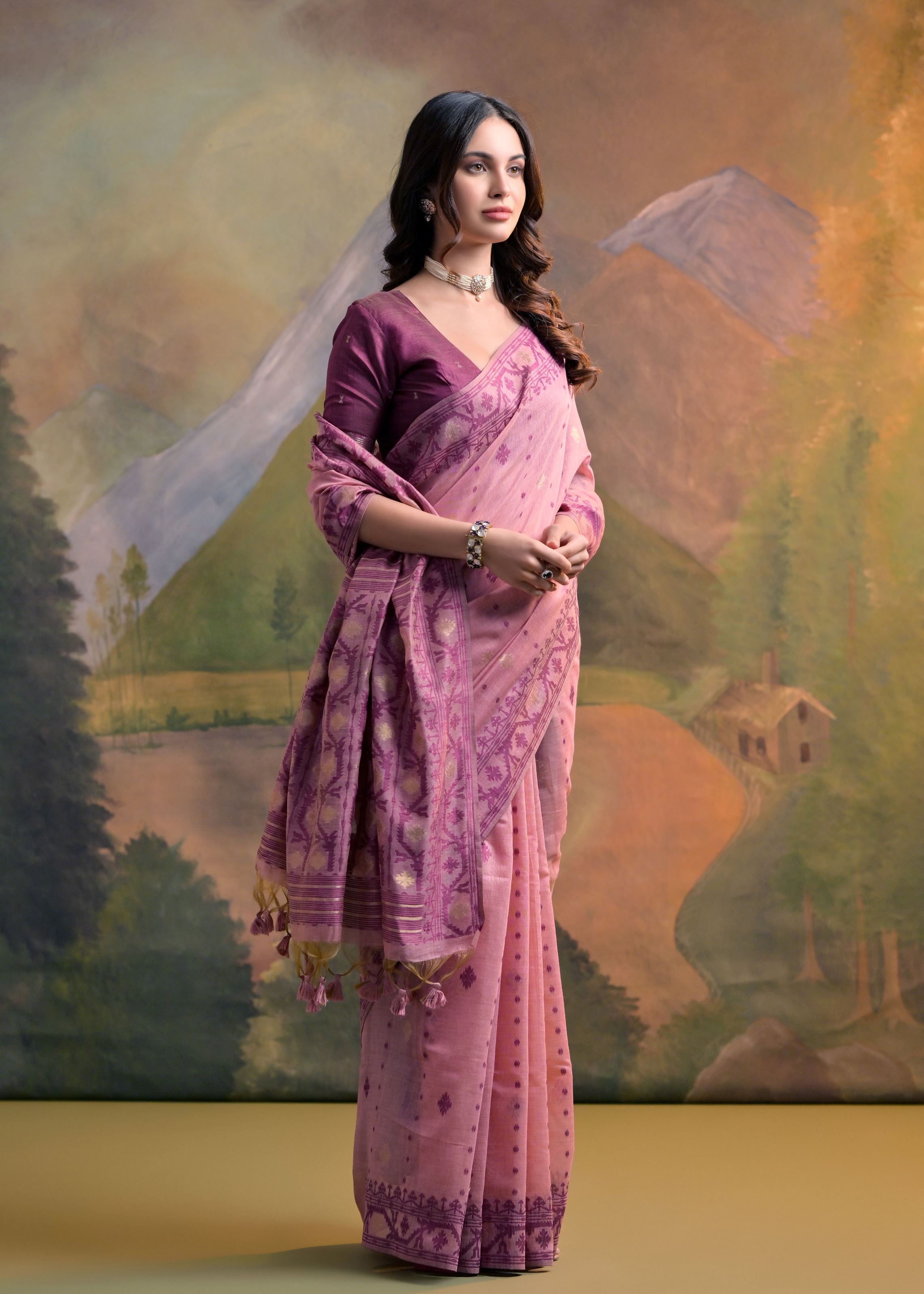 Channel timeless femininity with Aethnofit Fashions’ Pink Muga Cotton Saree, woven with delicate thread butti weaves that celebrate subtle Indian craftsmanship. Made from fine-quality Muga cotton, this saree offers a soft, breathable texture that keeps you comfortable through festive rituals, intimate gatherings, or long celebratory days.