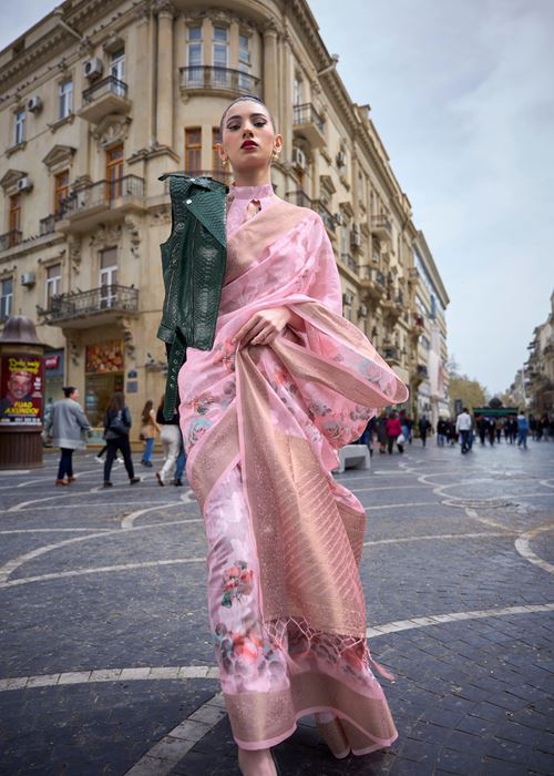 Pink Poly Brasso Handloom Silk Saree With Printed Poly Brasso Handloom Waving