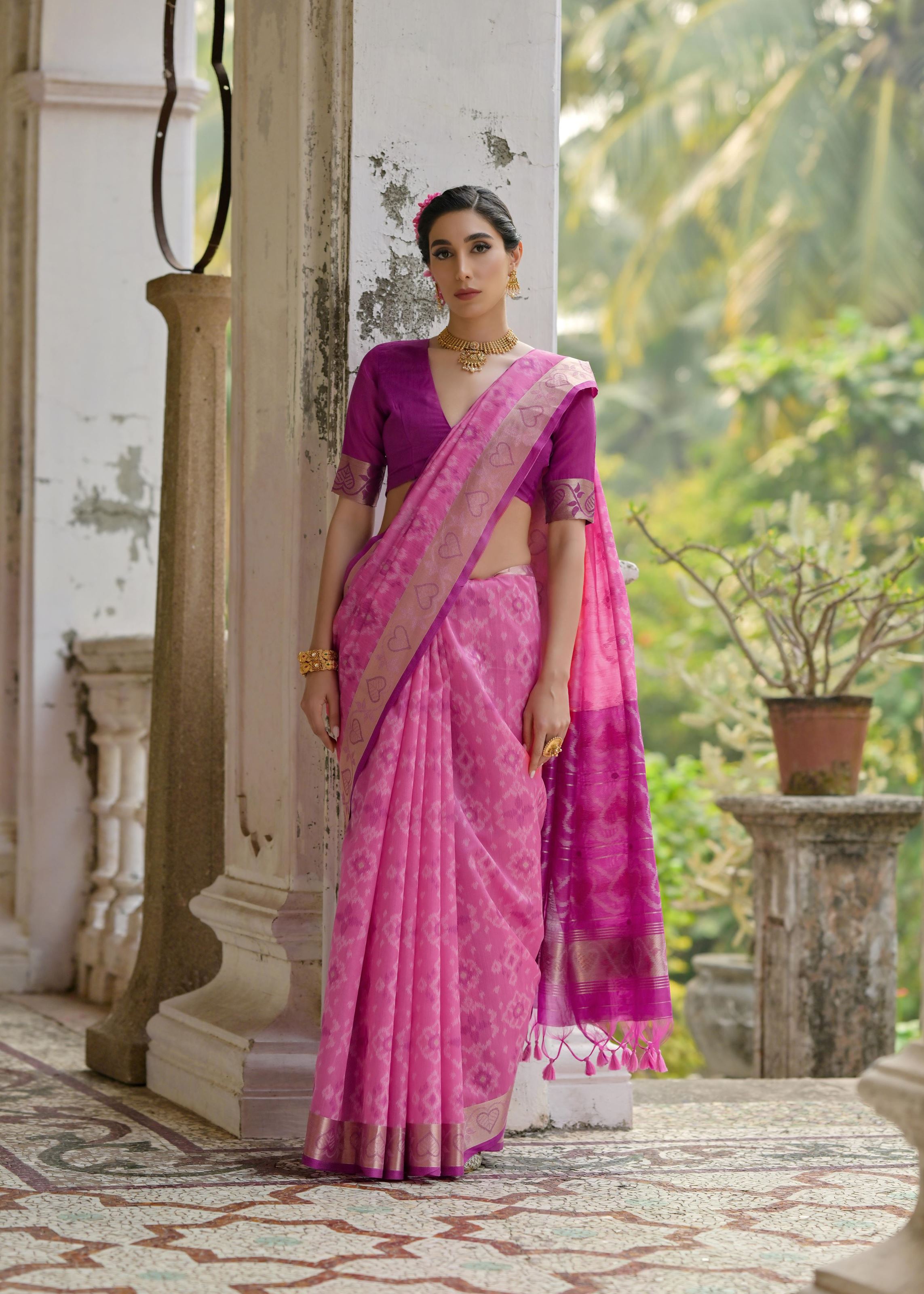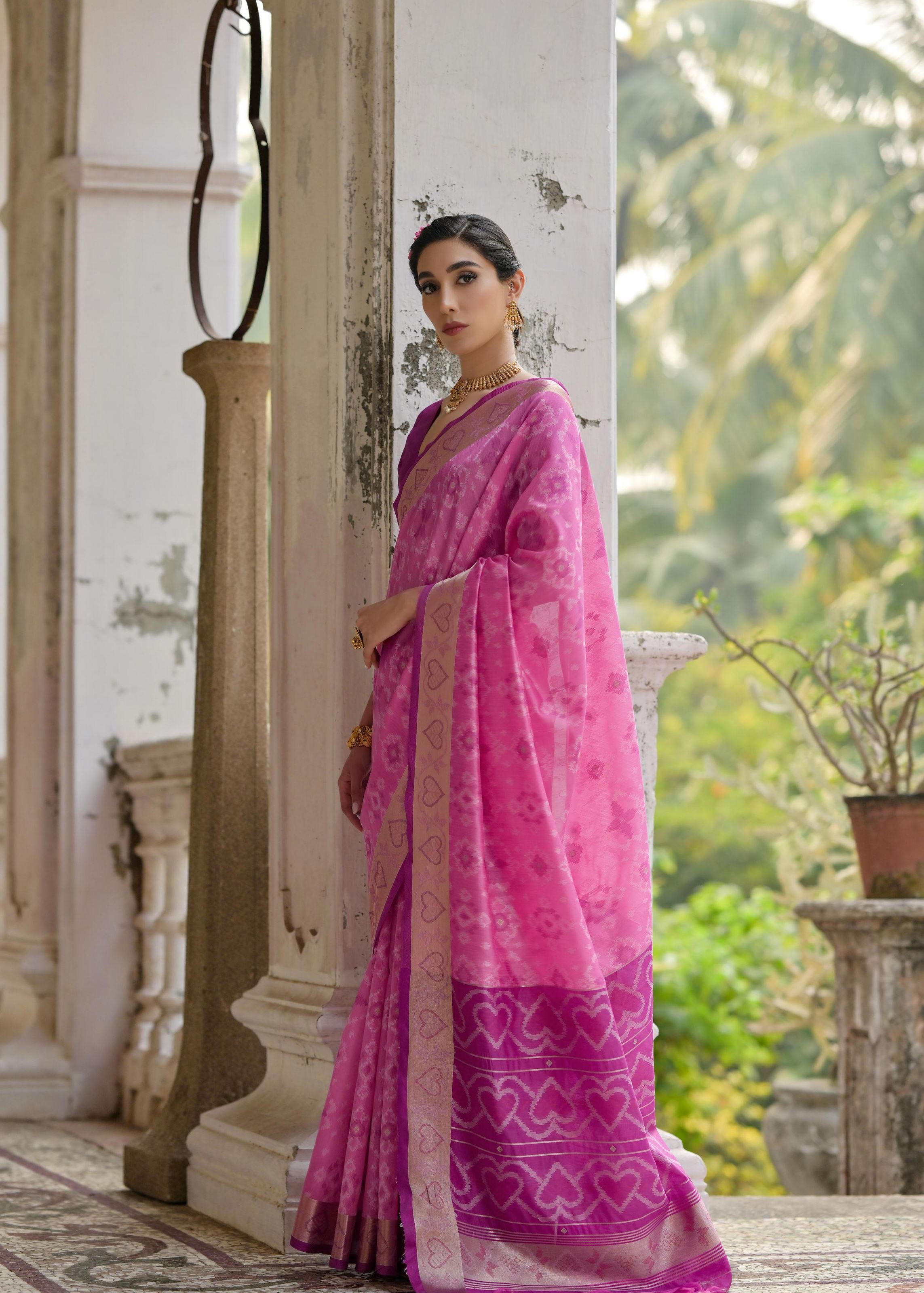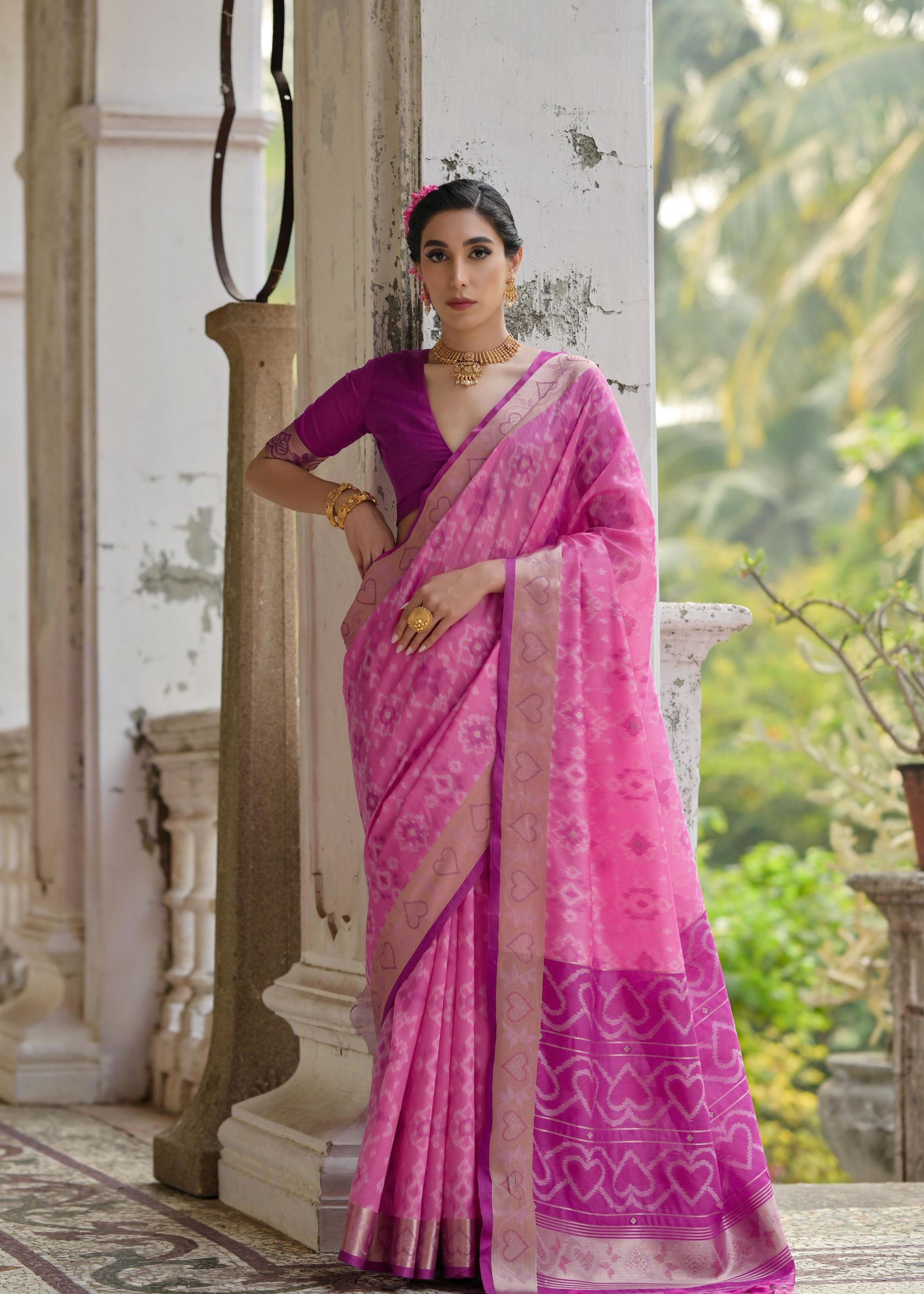 Pink Raw Silk Woven Ikat Designer Ceremonial Saree