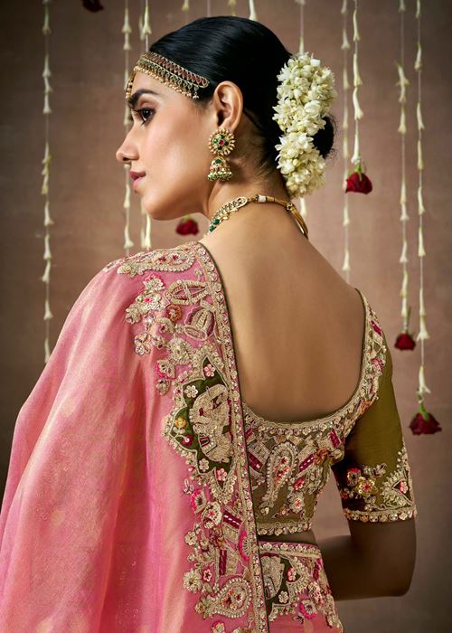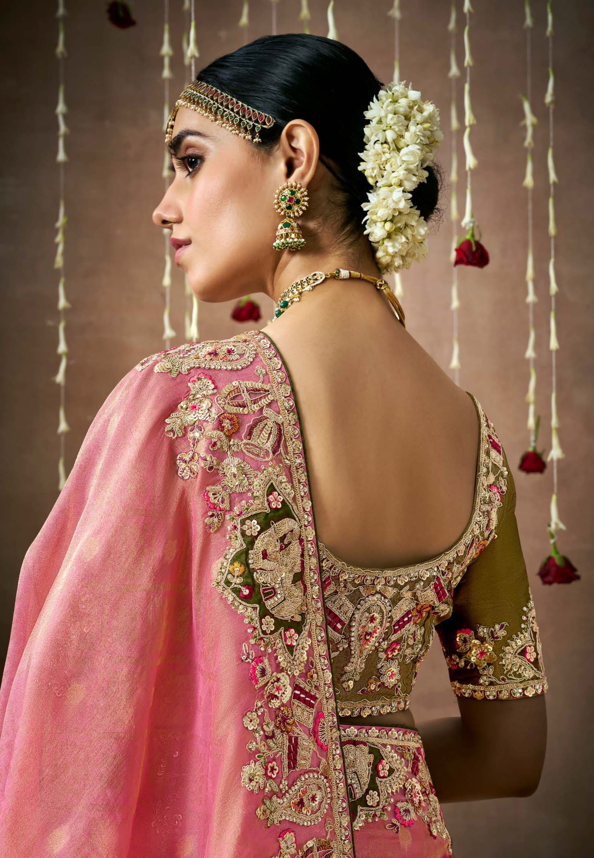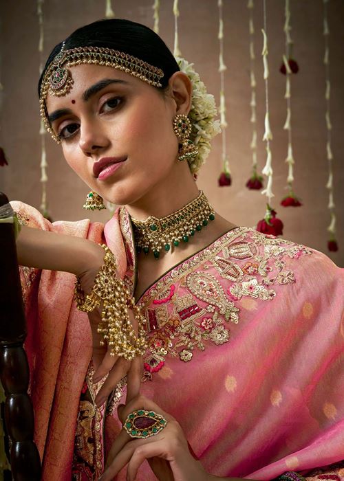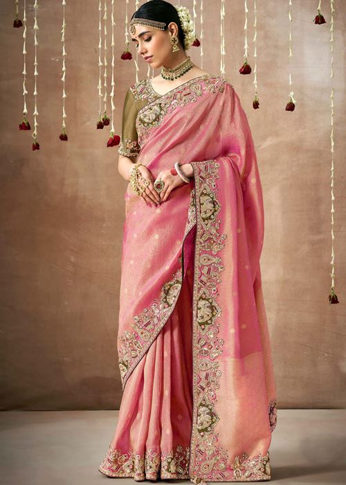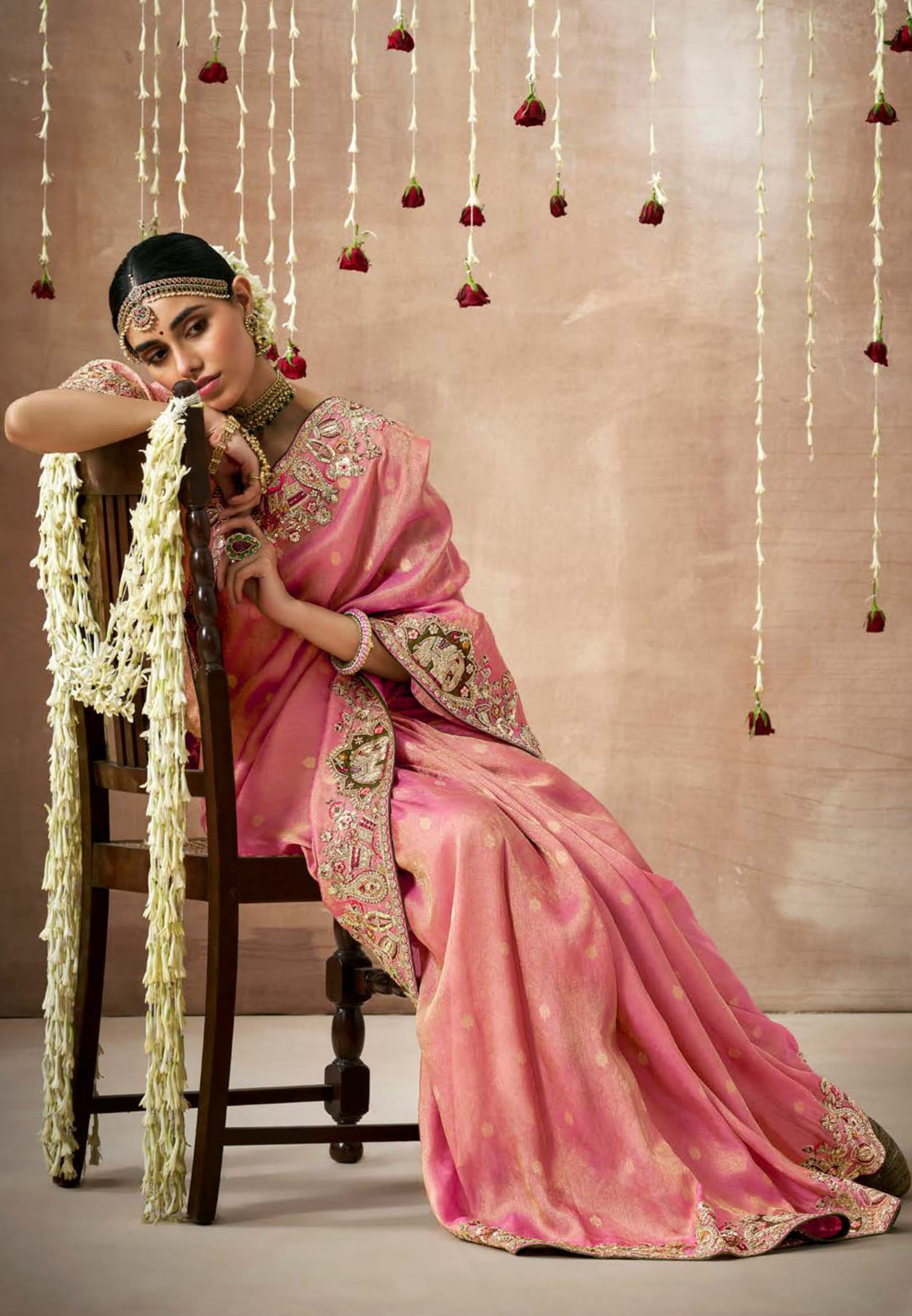 Pink Saree With Jacquard Woven With Heavy Thread Embroidery Sequins Work