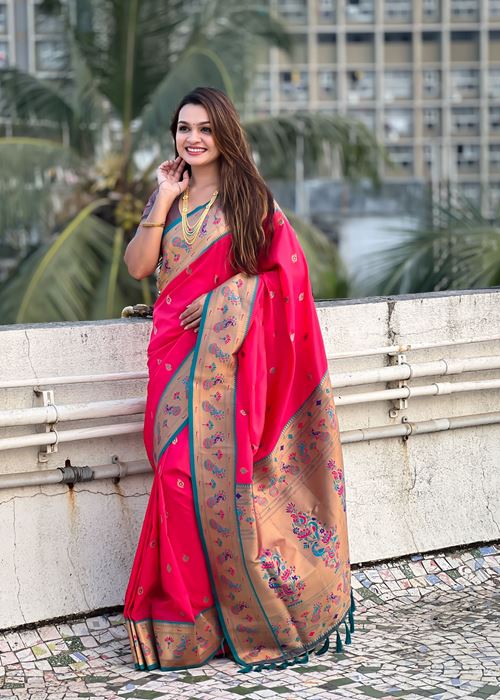 Pink Silk Blend Paithani Saree