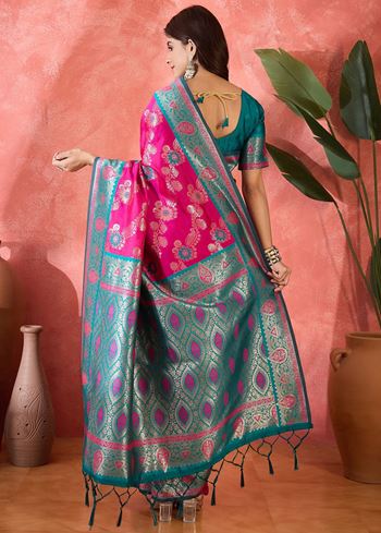 Step into elegance and grace with this Pink Silk Woven Designer Partywear Saree, a true masterpiece for your festive and wedding collection. Made from a premium silk blend fabric, the saree offers a rich texture and effortless drape, ensuring you look stunning on every special occasion. The soft pink hue adds a touch of femininity and charm, making it an ideal choice for celebrations, receptions, and traditional gatherings.