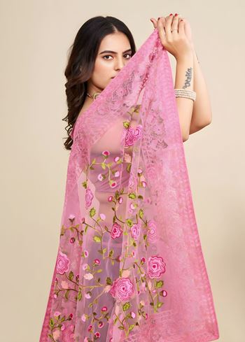 Pink Soft Net Saree with C-Pallu Chikankari Embroidery Work