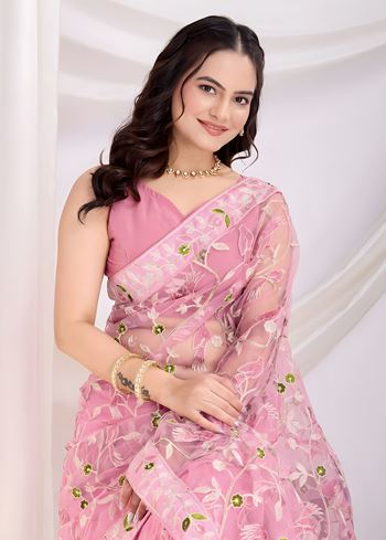 Pink Soft Net Saree with C Pallu Embroidery with sequins Work