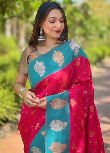 The exquisite woven jari patterns showcase meticulous craftsmanship, blending traditional artistry with modern designer appeal. Lightweight yet luxurious, this saree ensures comfort while making a statement at every event. Its vibrant pink shade is flattering for all skin tones, and the complementary blouse elevates the overall look, making it ideal for party wear or ceremonial functions.