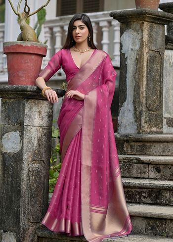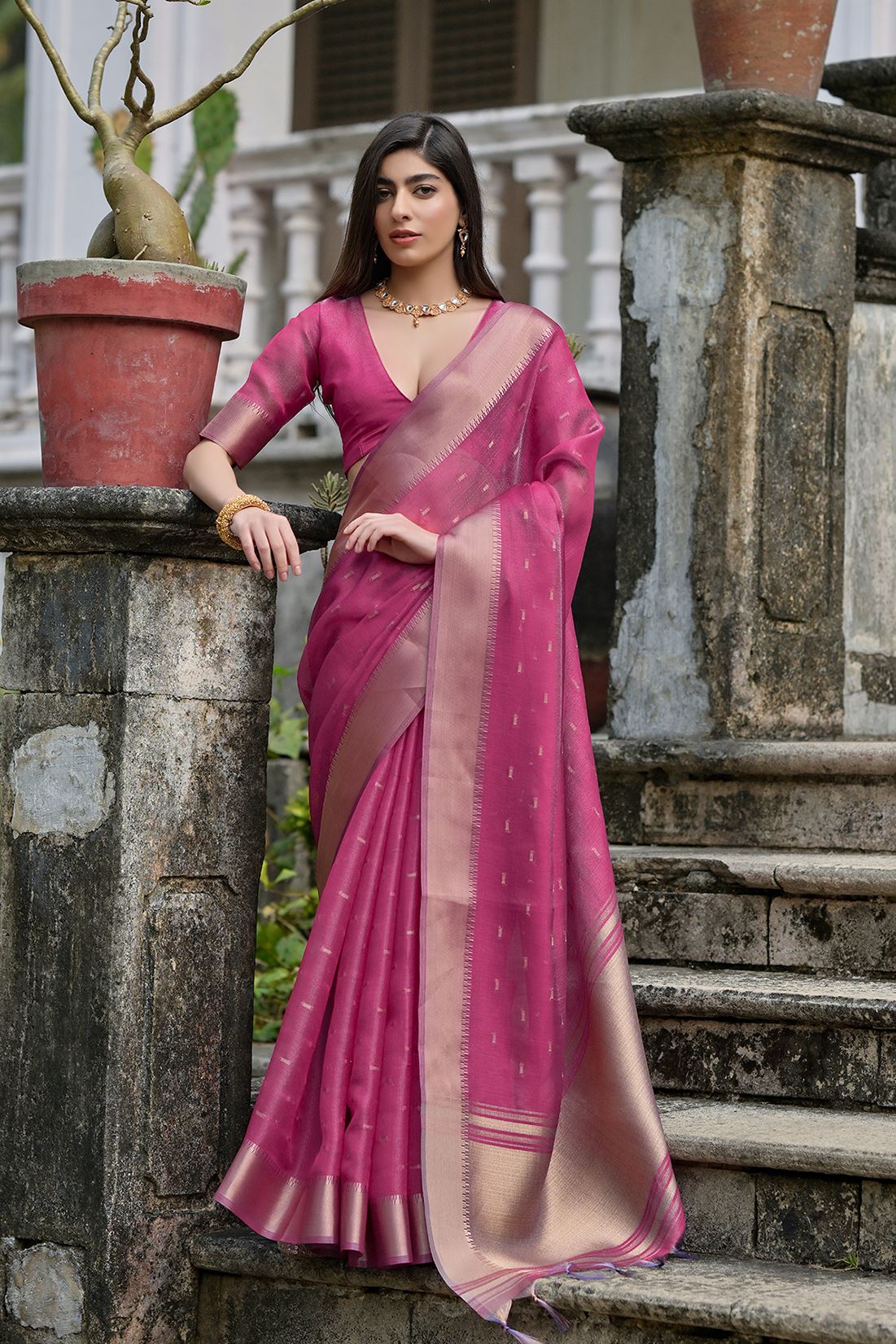Completing the look is a matching pink blouse in soft tussar silk, offering cohesive styling while allowing space for creative personalization with cuts or embellishments. Whether paired with delicate pearl jewellery or statement gold pieces, this saree adapts effortlessly to any look.