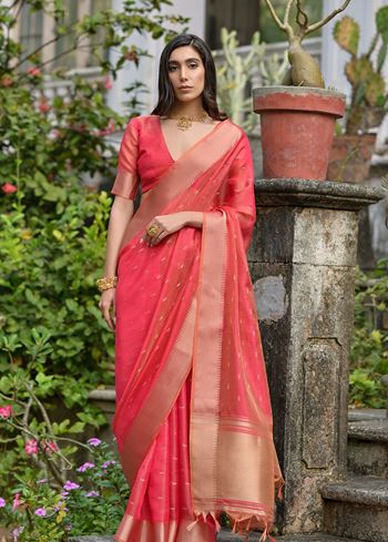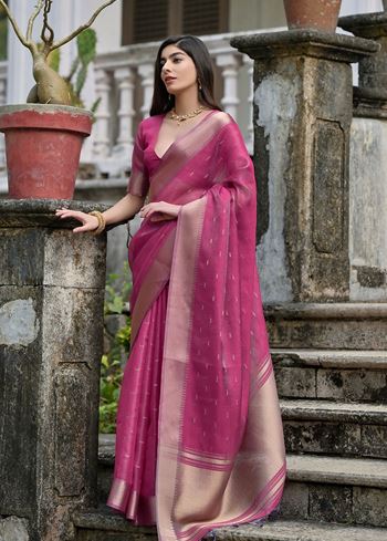 The soft pink hue radiates a youthful and serene vibe, making it perfect for daytime events, festive gatherings, or celebratory moments. Tiny woven buttis scattered across the saree body add a hint of tradition, while the zari pallu introduces a beautiful contrast with its intricate patterns and luminous golden shimmer—ideal for enhancing the festive essence.