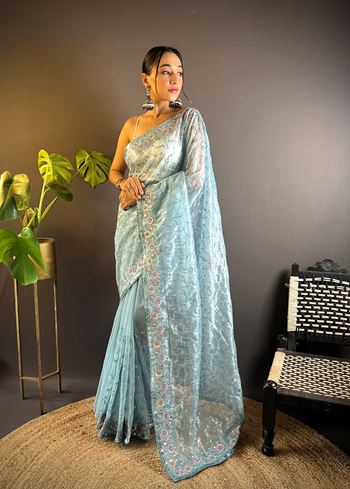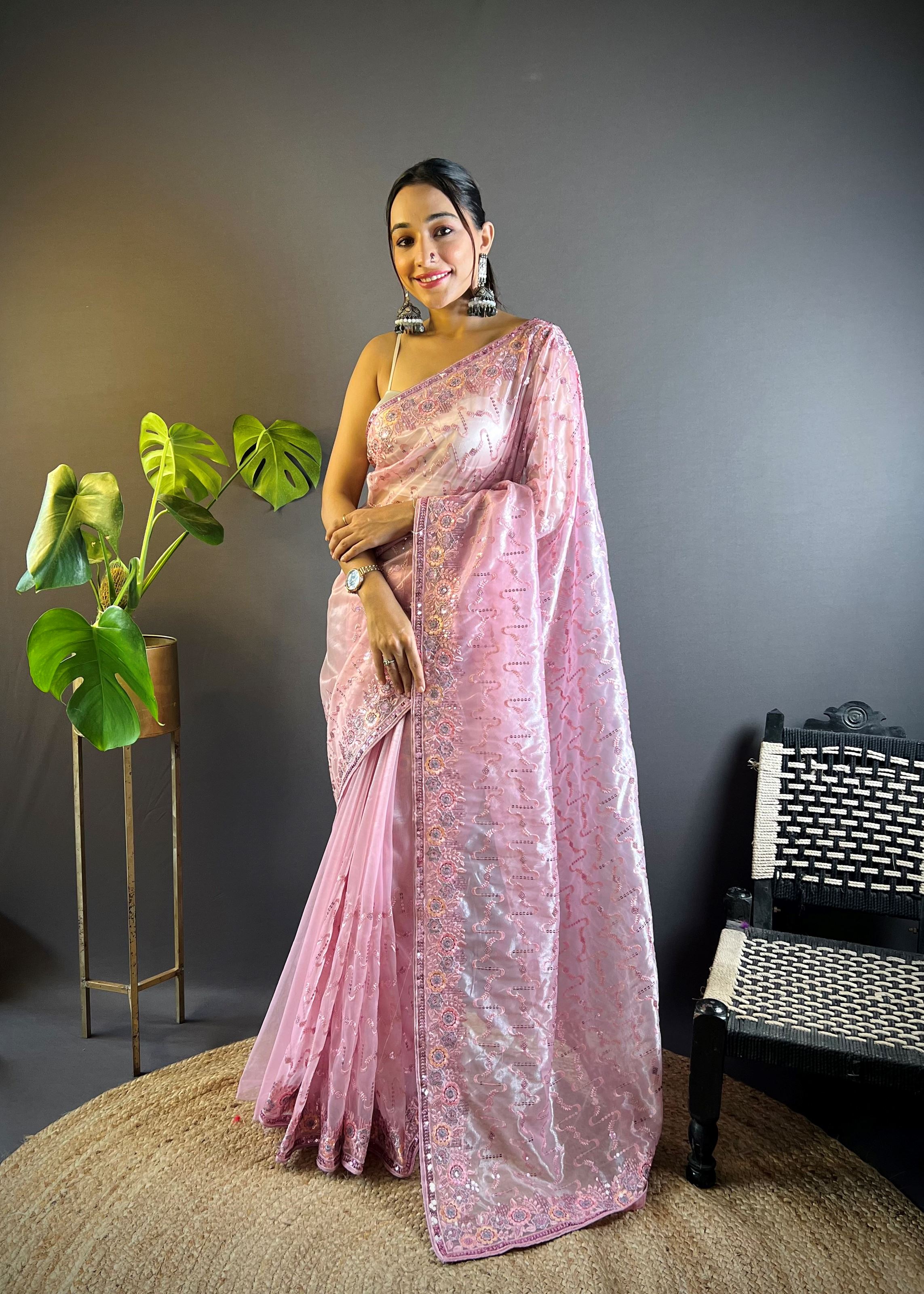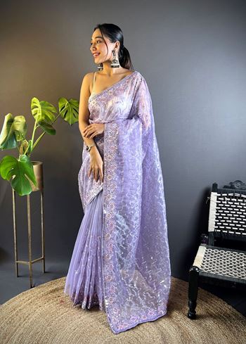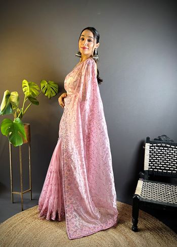 This saree comes with a matching pink net blouse, carefully designed to complement the embroidered detailing of the drape. Its lightweight texture ensures effortless styling and comfortable wear, even during long hours. Pair it with elegant jewelry and stylish footwear to create a statement look that balances tradition and trend. Whether you prefer a subtle style or a glamorous appearance, this embroidered saree adapts beautifully to your occasion.
