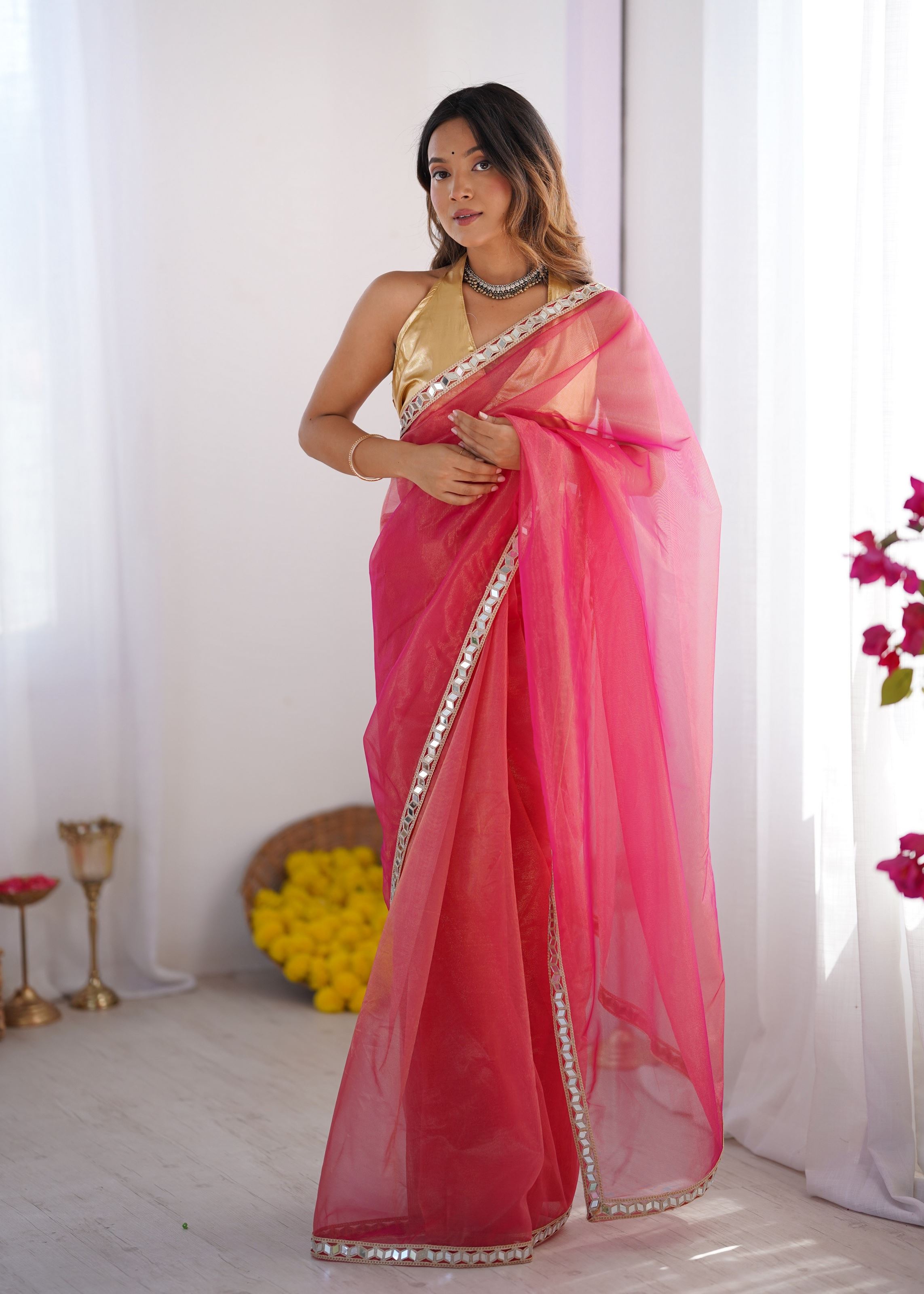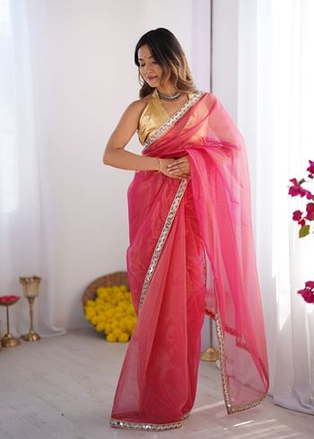 Pink Twill Net Solid Designer With Lace Border Bollywood Style Saree