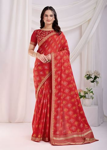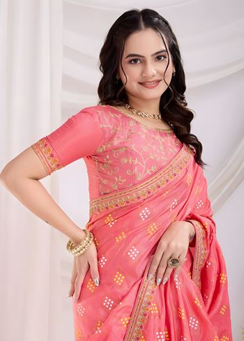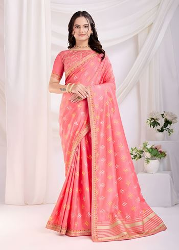 Pink Vichitra silk Saree with Golden Foil bandhani print with embroidery work lace