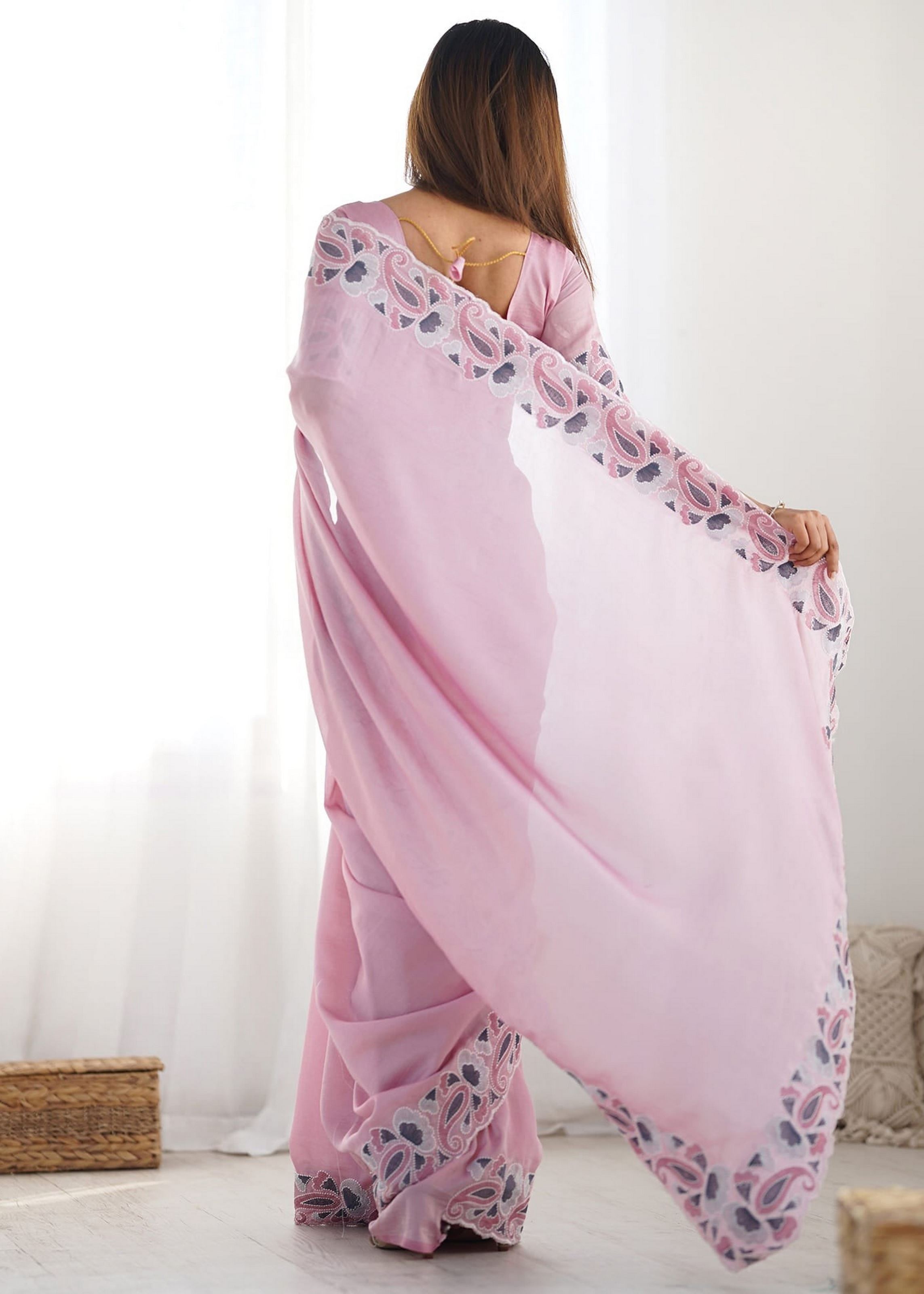 This saree is adorned with exquisite embroidered work, adding richness and elegance to the overall design. It comes with a matching art silk blouse in pink, perfectly complementing the saree for a cohesive and stylish look. The blouse can be custom-stitched for a perfect fit that enhances your silhouette.