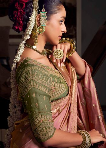 The ensemble is elevated by a contrasting mehendi pure viscose tissue blouse, tastefully embroidered to add depth and richness to the overall look. The earthy green tone of the blouse balances the soft romance of the pink saree, creating a harmonious and eye-catching pairing. The detailed embroidery further enhances its festive allure, making this saree a timeless piece for your ethnic wardrobe.