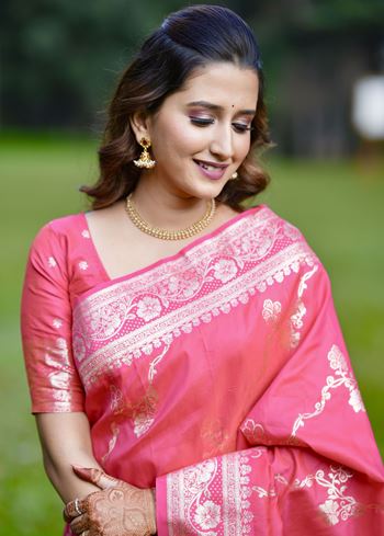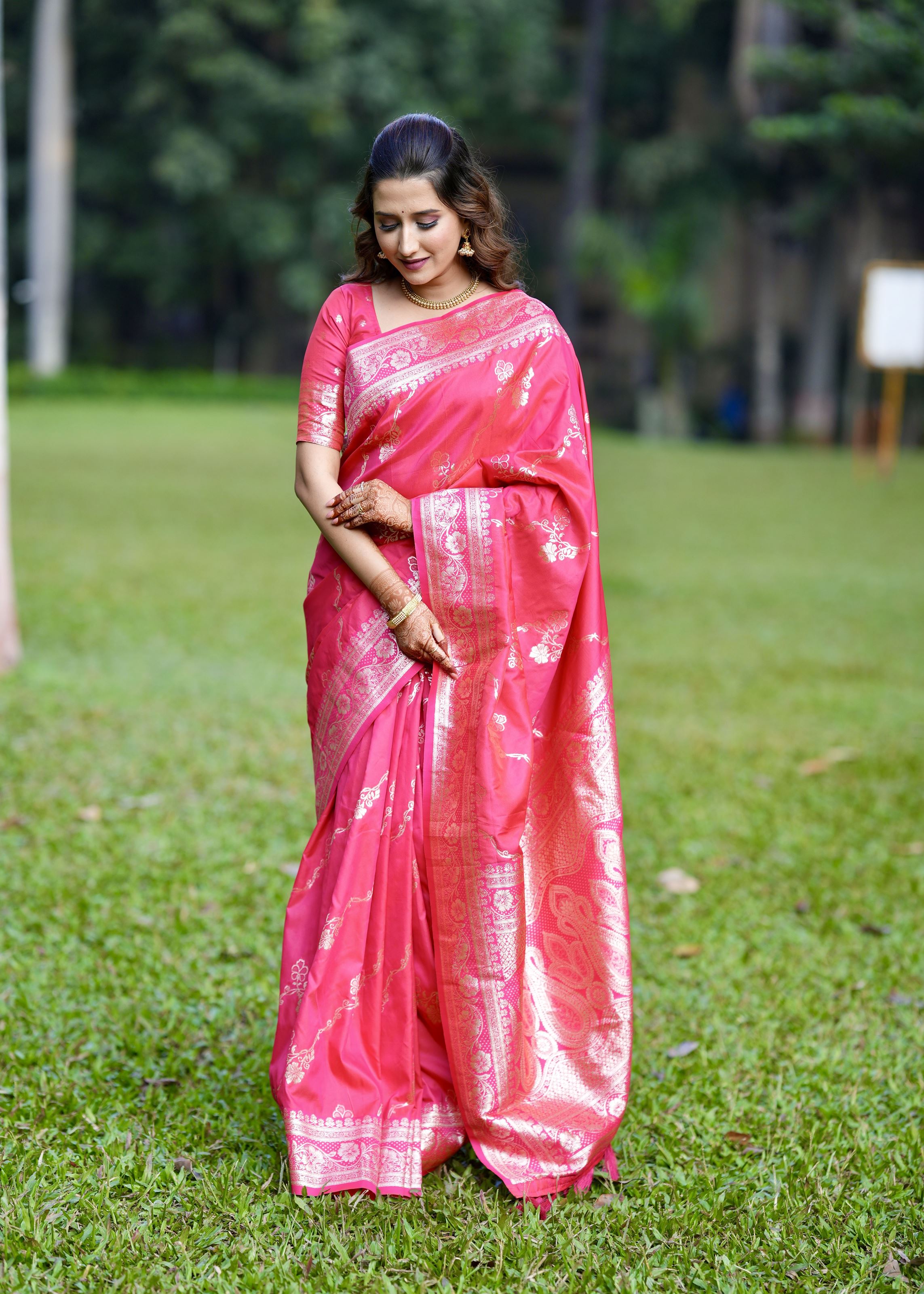 Paired with a matching pink silk blouse, this saree ensures a coordinated and polished ensemble. The lightweight yet rich Banarasi silk fabric drapes gracefully, providing all-day comfort while enhancing your festive-ready silhouette. Accessorize with statement jewelry, elegant heels, and ethnic accessories to complete a sophisticated outfit that leaves a lasting impression. Designed for women who appreciate authentic silk artistry, this saree merges tradition, opulence, and contemporary style seamlessly.