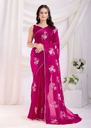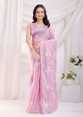 Made from lightweight Zimmy Chu fabric, the saree drapes effortlessly, offering a breezy yet structured silhouette. The C-Pallu showcases vibrant multicolored thread embroidery enhanced with sparkly sequins, bringing depth and festive flair to the look. It comes with a matching pink blouse in Mono Banglory silk, ready to be tailored for a flattering fit.