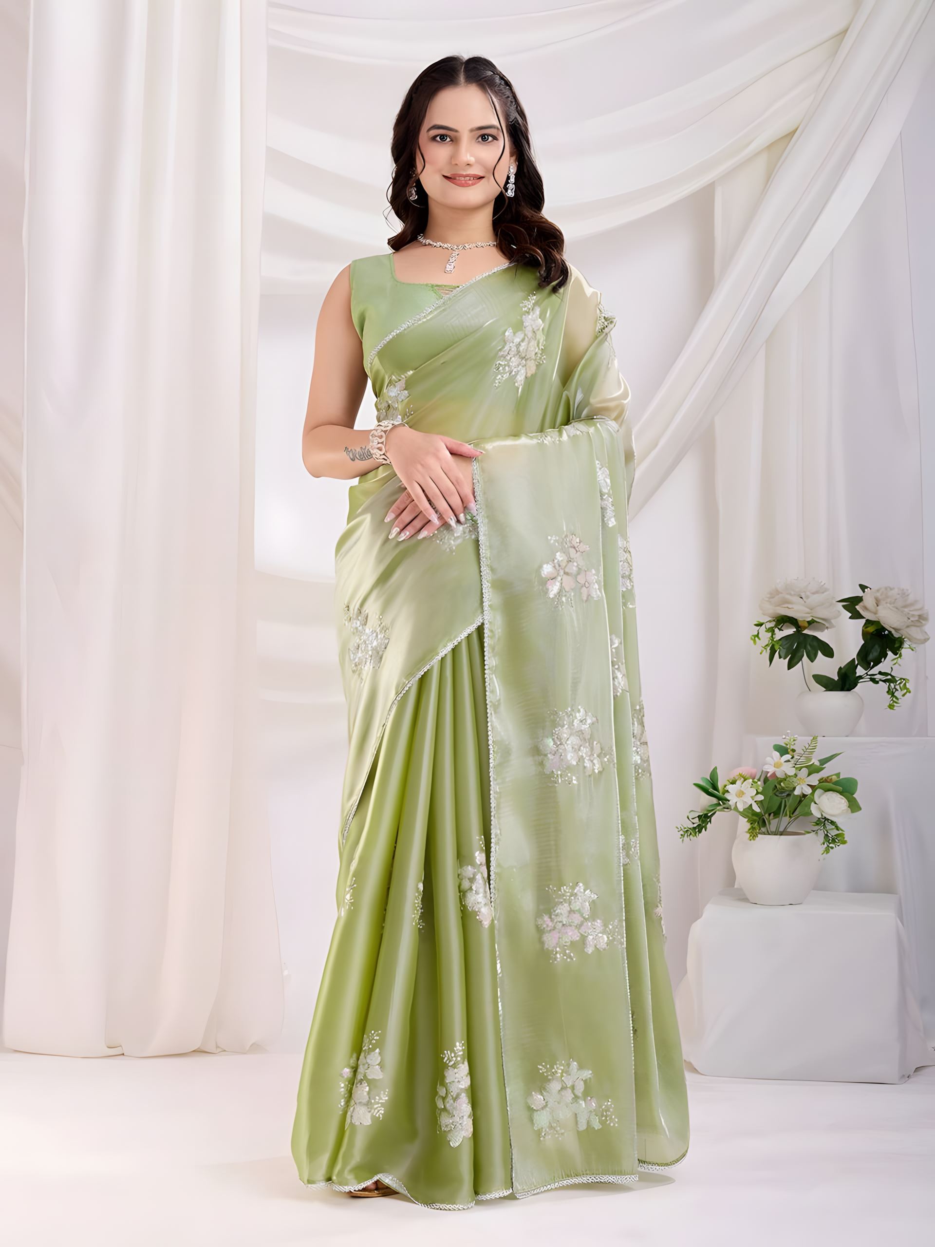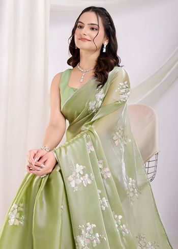 Woven in lightweight Zimmy Chu fabric, the saree drapes with fluid ease, combining comfort and style effortlessly. The C-Pallu becomes the highlight of the ensemble, adorned with intricate, multicolored threadwork and dainty sequins that glisten under light. A matching pista blouse in Mono Banglory silk complements the look, ready for custom tailoring to achieve the perfect fit.