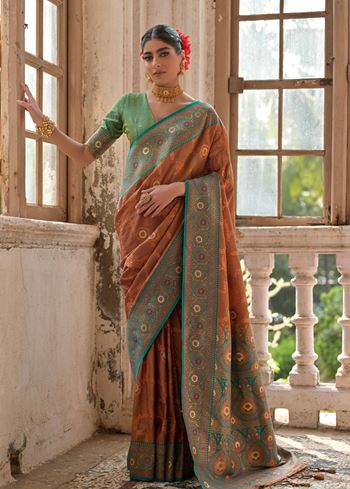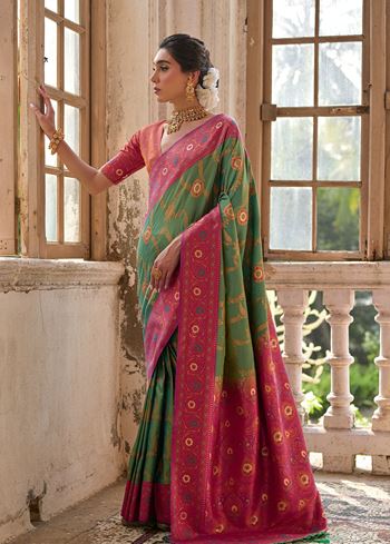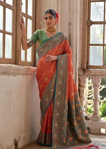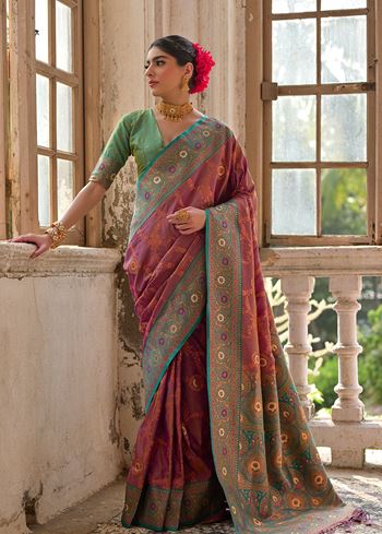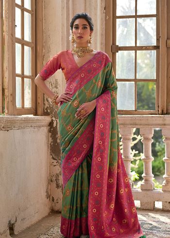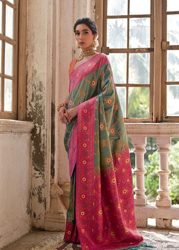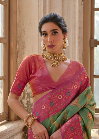 Pista Banarasi Silk Saree with Floral Jal and Contrast Pallu