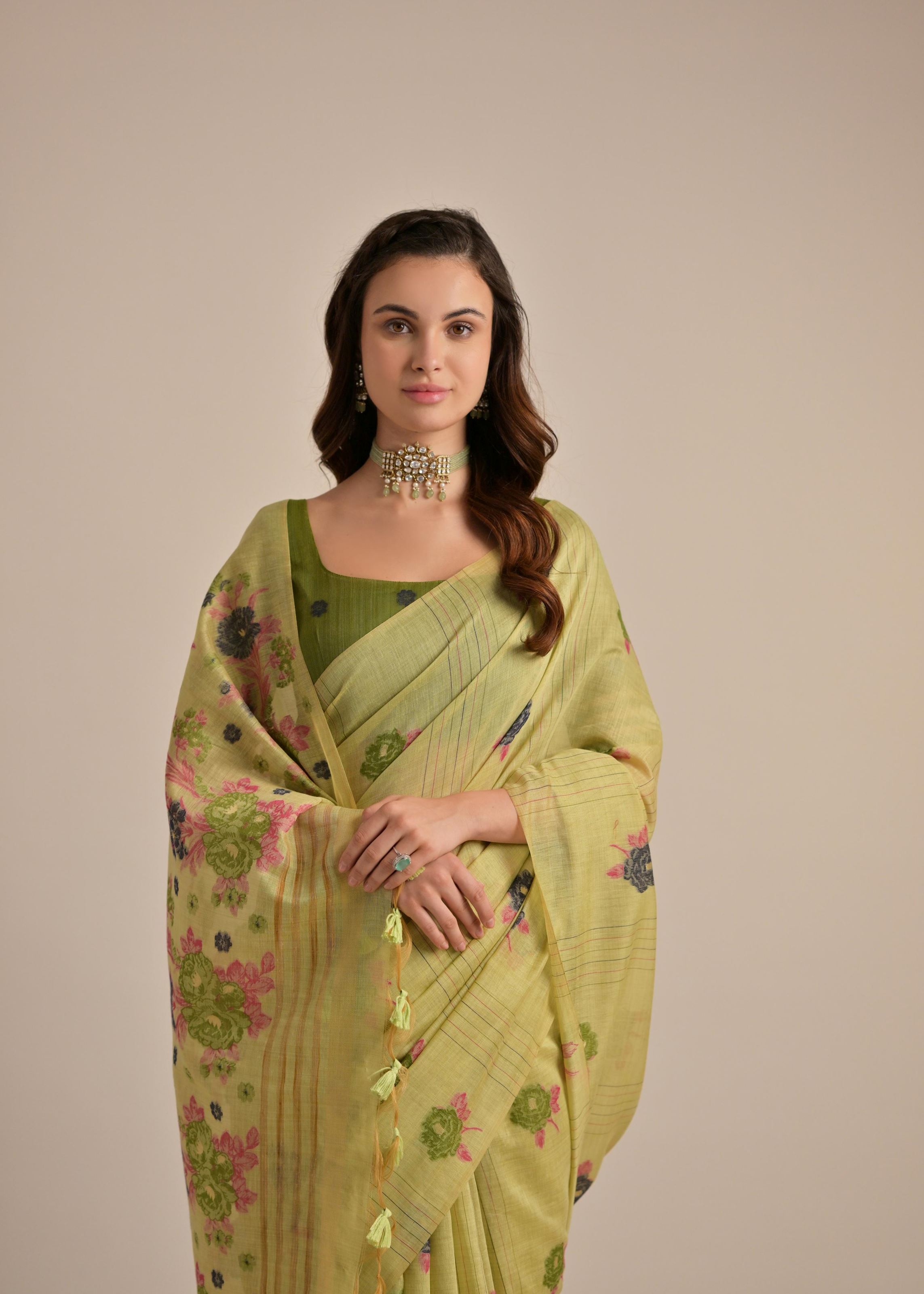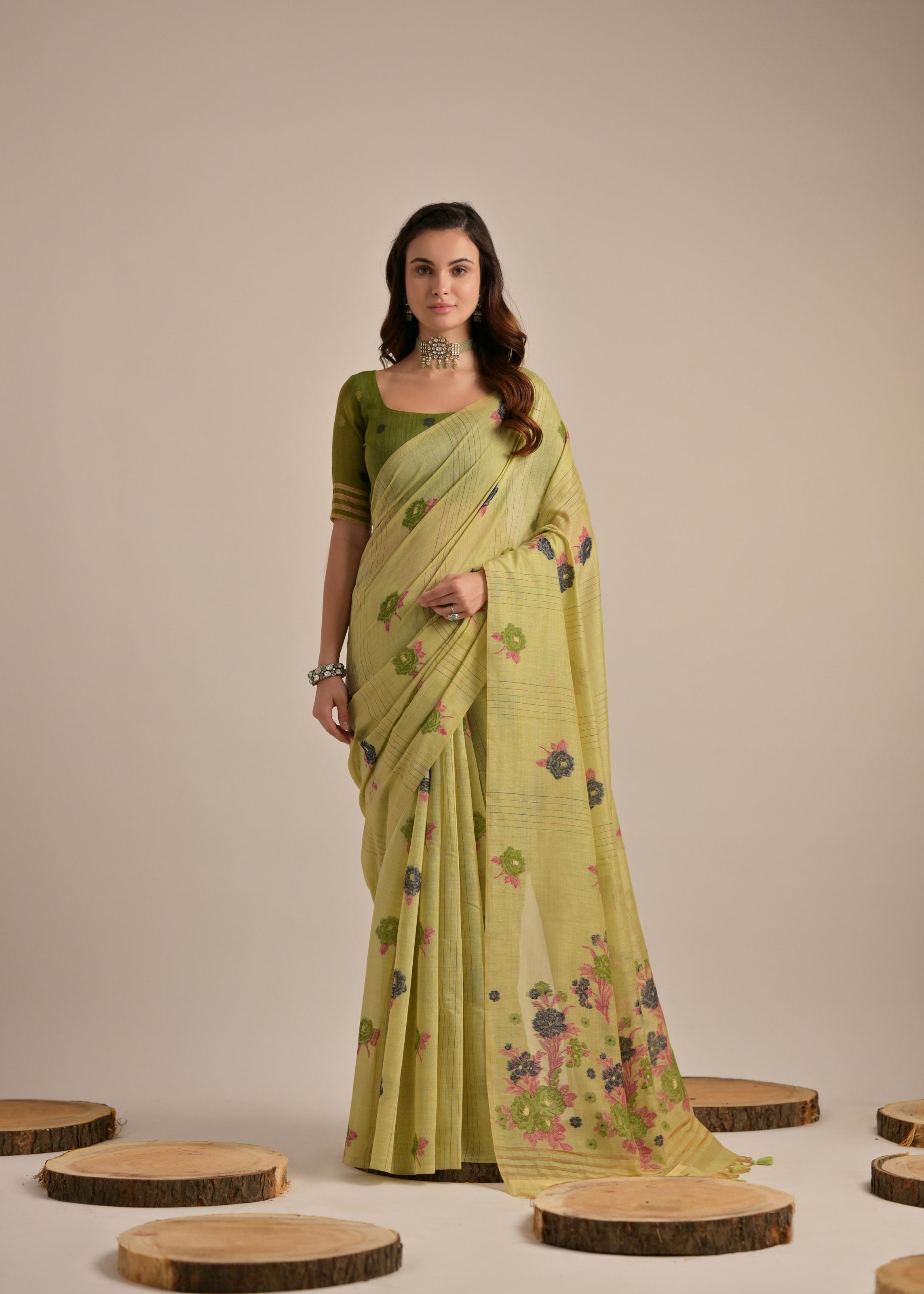 Radiate elegance with this Pista Beautiful Girly Looks Multy Floral Weaving Designer Muga Cotton Saree from Aethnofit Fashions. Expertly crafted in blended cotton, this saree carries the natural richness of muga cotton while ensuring breathability and comfort. The pista green base is adorned with multi-floral woven motifs that reflect fine artistry and cultural charm. It is paired with a matching green blended cotton blouse, creating a graceful and harmonious look perfect for both festive and traditional occasions.